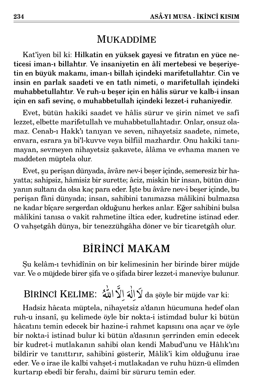 Kat’iyen bil ki: Hilkatin en yüksek gayesi ve fıtratın en yüce neticesi iman-ı billahtır. Ve insaniyetin en âlî mertebesi ve beşeriyetin en büyük makamı, iman-ı billah içindeki marifetullahtır. Cin ve insin en parlak saadeti ve en tatlı nimeti, o marifetullah içindeki muhabbetullahtır. Ve ruh-u beşer için en hâlis sürur ve kalb-i insan için en safi sevinç, o muhabbetullah içindeki lezzet-i ruhaniyedir.