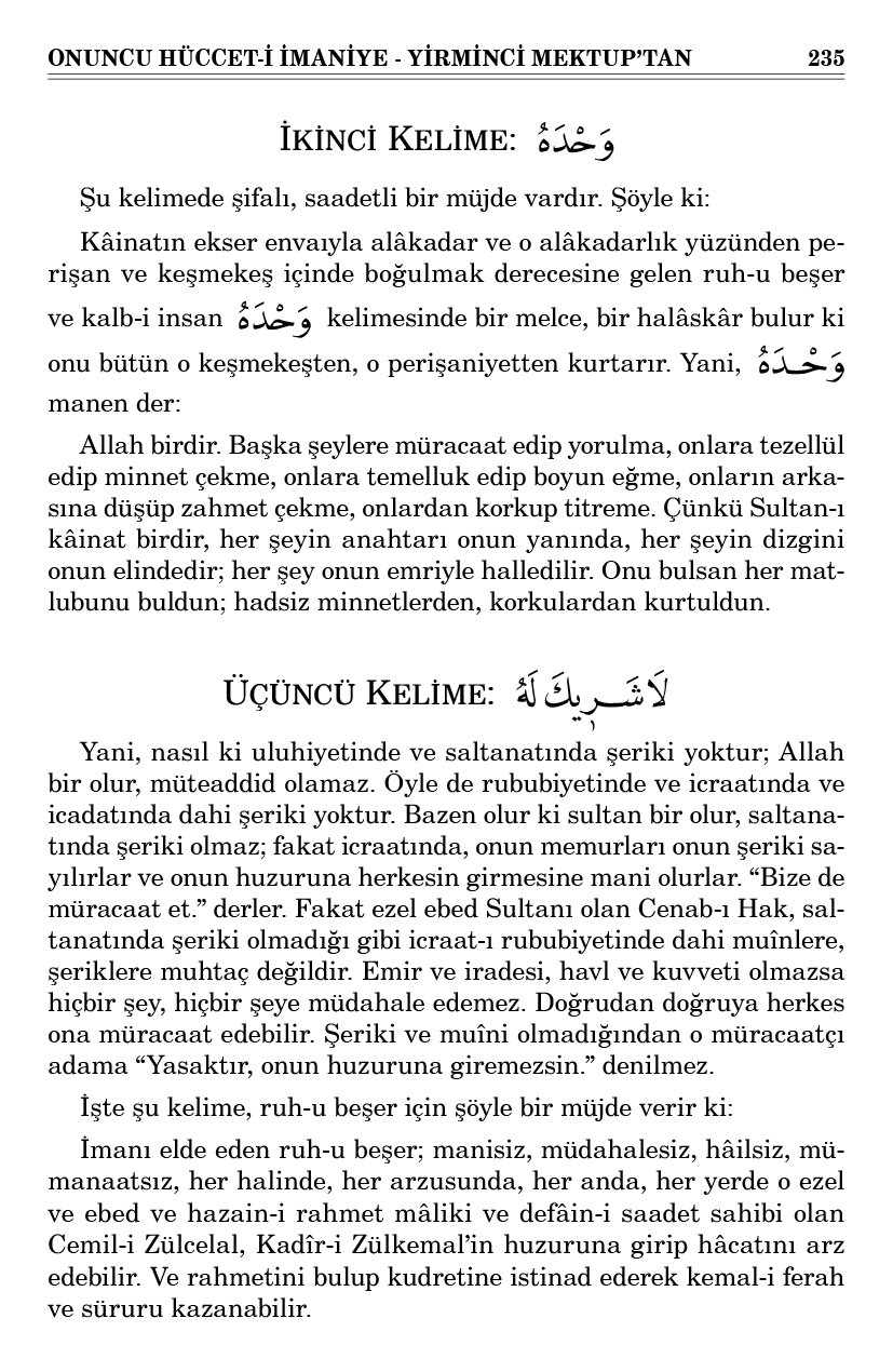 Hadsiz hâcata müptela, nihayetsiz a’danın hücumuna hedef olan ruh-u insanî, şu kelimede öyle bir nokta-i istimdad bulur ki bütün hâcatını temin edecek bir hazine-i rahmet kapısını ona açar ve öyle bir nokta-i istinad bulur ki bütün a’dasının şerrinden emin edecek bir kudret-i mutlakanın sahibi olan kendi Mabud’unu ve Hâlık’ını bildirir ve tanıttırır, sahibini gösterir, Mâlik’i kim olduğunu irae eder. Ve o irae ile kalbi vahşet-i mutlakadan ve ruhu hüzn-ü elîmden kurtarıp ebedî bir ferahı, daimî bir süruru temin eder.