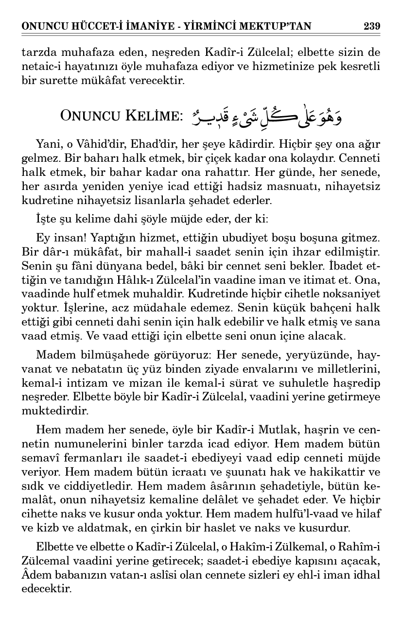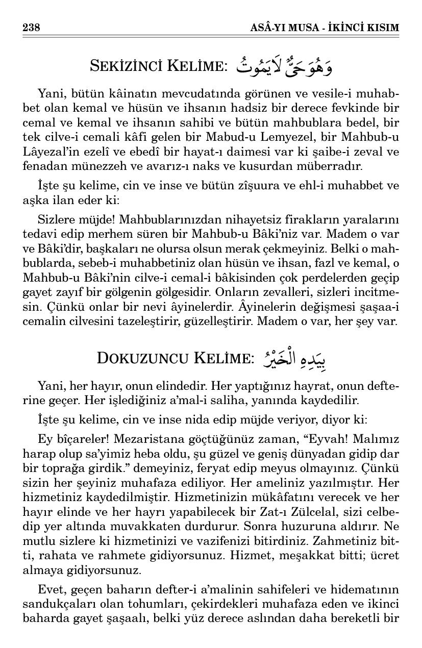Yani, bütün kâinatın mevcudatında görünen ve vesile-i muhabbet olan kemal ve hüsün ve ihsanın hadsiz bir derece fevkinde bir cemal ve kemal ve ihsanın sahibi ve bütün mahbublara bedel, bir tek cilve-i cemali kâfi gelen bir Mabud-u Lemyezel, bir Mahbub-u Lâyezal’in ezelî ve ebedî bir hayat-ı daimesi var ki şaibe-i zeval ve fenadan münezzeh ve avarız-ı naks ve kusurdan müberradır. İşte şu kelime, cin ve inse ve bütün zîşuura ve ehl-i muhabbet ve aşka ilan eder ki: