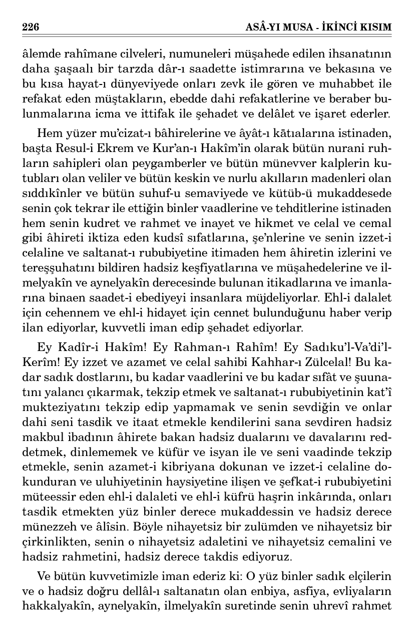 hazinelerine, âlem-i bekadaki ihsanatının definelerine ve dâr-ı saadette tamamıyla zuhur eden güzel isimlerinin hârika güzel cilvelerine şehadetleri hak ve hakikattir ve işaretleri doğru ve mutabıktır ve beşaretleri sadık ve vakidir. Ve onlar, bütün hakikatlerin mercii ve güneşi ve hâmisi olan “Hak” isminin en büyük bir şuâı, bu hakikat-i ekber-i haşriye olduğunu iman ederek senin emrin ile senin ibadına hak dairesinde ders veriyorlar ve ayn-ı hakikat olarak talim ediyorlar.