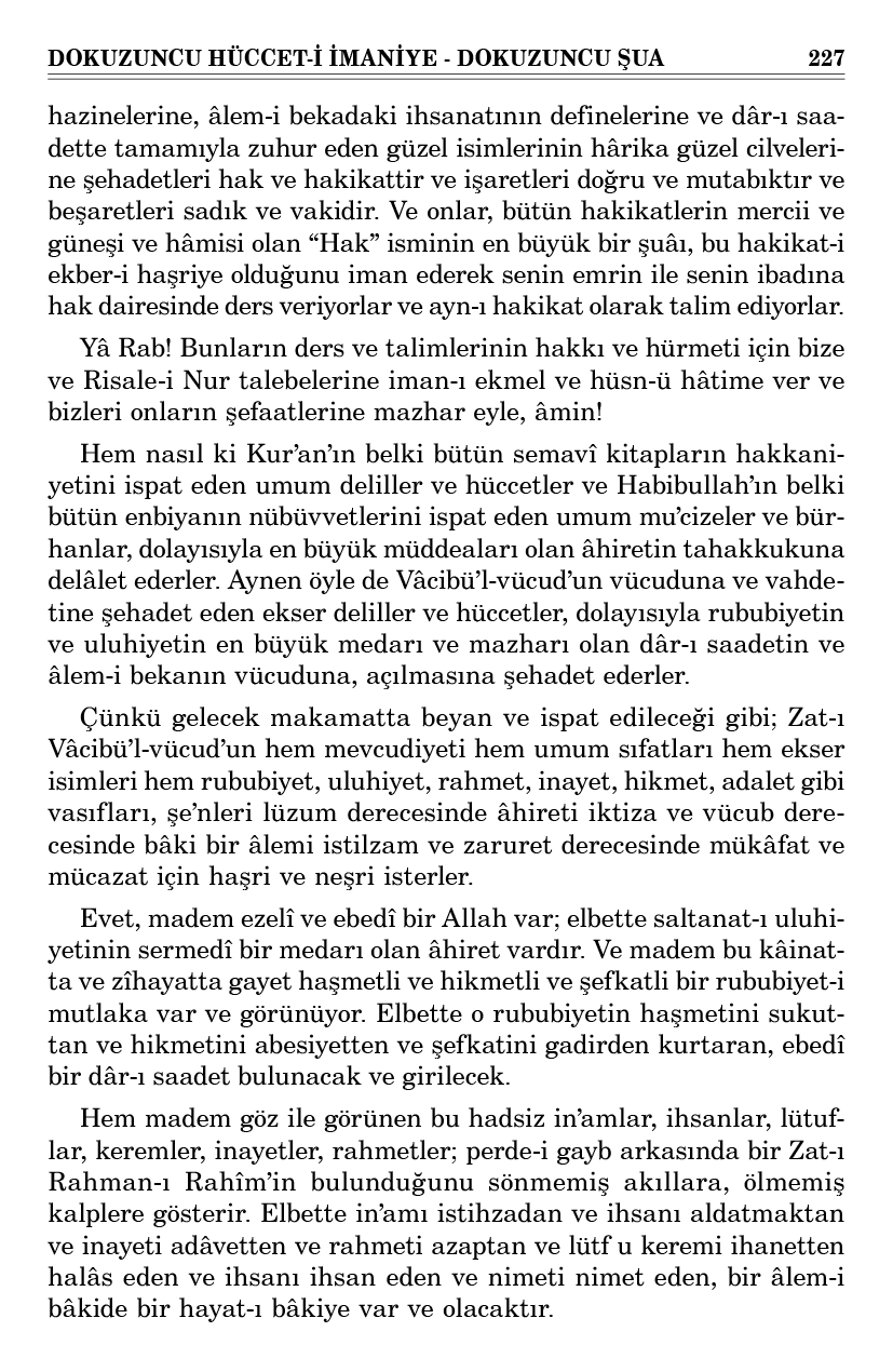 Hem nasıl ki Kur’an’ın belki bütün semavî kitapların hakkaniyetini ispat eden umum deliller ve hüccetler ve Habibullah’ın belki bütün enbiyanın nübüvvetlerini ispat eden umum mu’cizeler ve bürhanlar, dolayısıyla en büyük müddeaları olan âhiretin tahakkukuna delâlet ederler. Aynen öyle de Vâcibü’l-vücud’un vücuduna ve vahdetine şehadet eden ekser deliller ve hüccetler, dolayısıyla rububiyetin ve uluhiyetin en büyük medarı ve mazharı olan dâr-ı saadetin ve âlem-i bekanın vücuduna, açılmasına şehadet ederler.