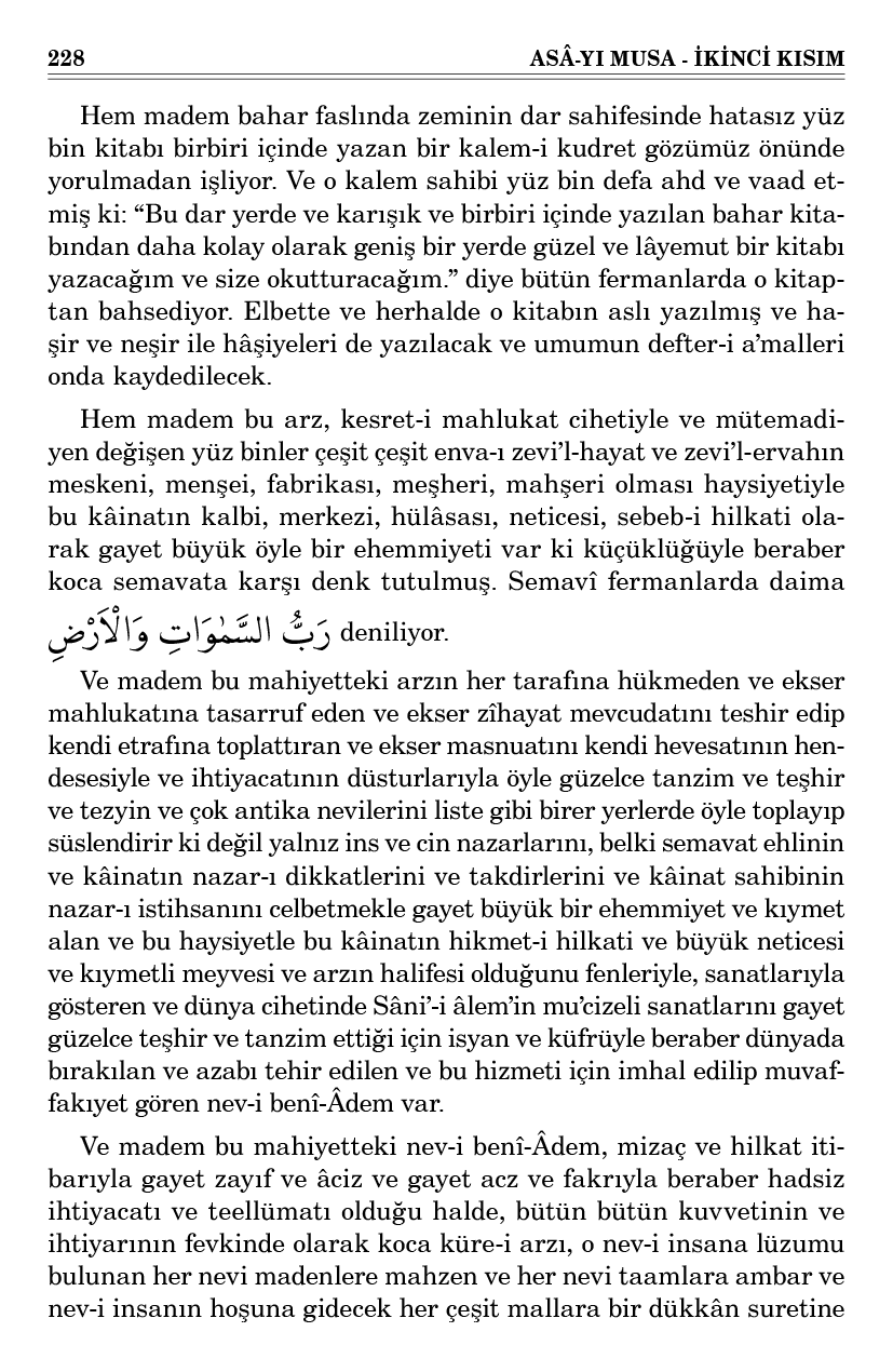 Ve madem bu hakikatteki bir Rab, hem insanı sever hem kendini insana sevdirir hem bâkidir hem bâki âlemleri var hem adaletle her işi görür ve hikmetle her şeyi yapıyor. Hem bu kısa hayat-ı dünyeviyede ve bu kısacık ömr-ü beşerde ve bu muvakkat ve fâni zeminde o Hâkim-i Ezelî’nin haşmet-i saltanatı ve sermediyet-i hâkimiyeti yerleşemiyor.