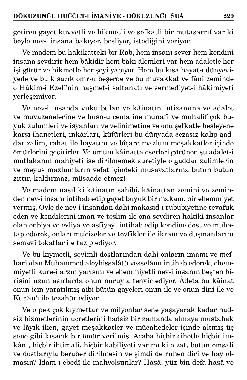 Ve nev-i insanda vuku bulan ve kâinatın intizamına ve adalet ve muvazenelerine ve hüsn-ü cemaline münafî ve muhalif çok büyük zulümleri ve isyanları ve velinimetine ve onu şefkatle besleyene karşı ihanetleri, inkârları, küfürleri bu dünyada cezasız kalıp gaddar zalim, rahat ile hayatını ve bîçare mazlum meşakkatler içinde ömürlerini geçirirler. Ve umum kâinatta eserleri görünen şu adalet-i mutlakanın mahiyeti ise dirilmemek suretiyle o gaddar zalimlerin ve meyus mazlumların vefat içindeki müsavatlarına bütün bütün zıttır, kaldırmaz, müsaade etmez!