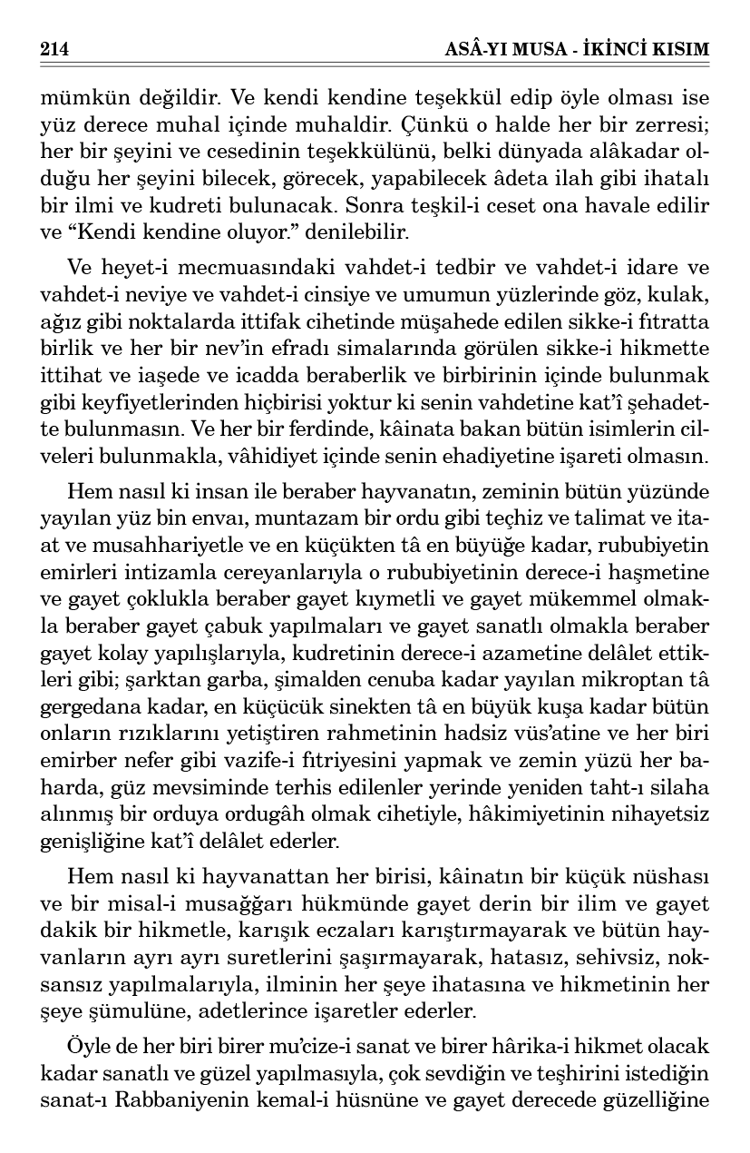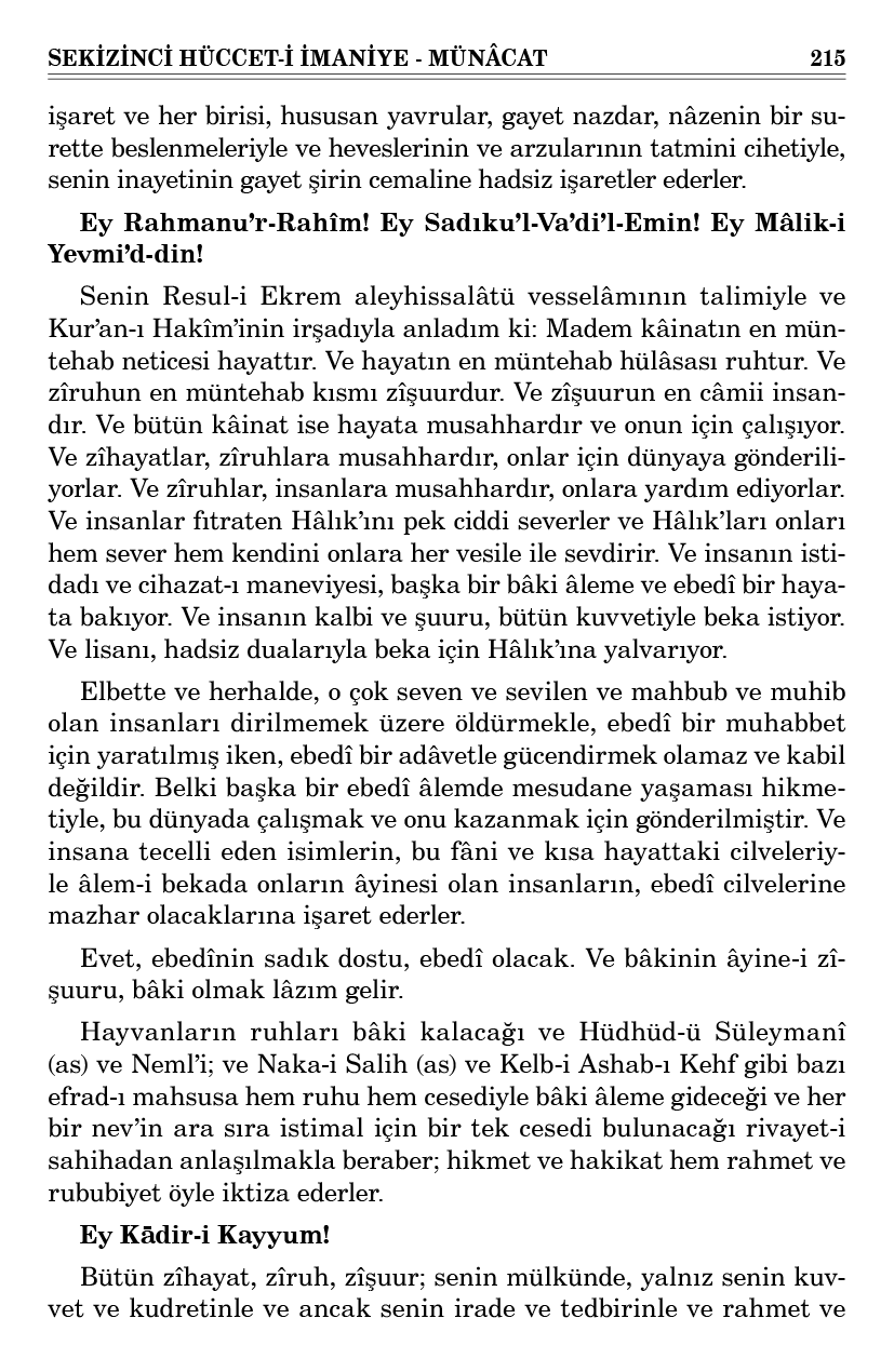 Senin Resul-i Ekrem aleyhissalâtü vesselâmının talimiyle ve Kur’an-ı Hakîm’inin irşadıyla anladım ki: Madem kâinatın en müntehab neticesi hayattır. Ve hayatın en müntehab hülâsası ruhtur. Ve zîruhun en müntehab kısmı zîşuurdur. Ve zîşuurun en câmii insandır. Ve bütün kâinat ise hayata musahhardır ve onun için çalışıyor. Ve zîhayatlar, zîruhlara musahhardır, onlar için dünyaya gönderiliyorlar. Ve zîruhlar, insanlara musahhardır, onlara yardım ediyorlar. Ve insanlar fıtraten Hâlık’ını pek ciddi severler ve Hâlık’ları onları hem sever hem kendini onlara her vesile ile sevdirir. Ve insanın istidadı ve cihazat-ı maneviyesi, başka bir bâki âleme ve ebedî bir hayata bakıyor. Ve insanın kalbi ve şuuru, bütün kuvvetiyle beka istiyor. Ve lisanı, hadsiz dualarıyla beka için Hâlık’ına yalvarıyor.