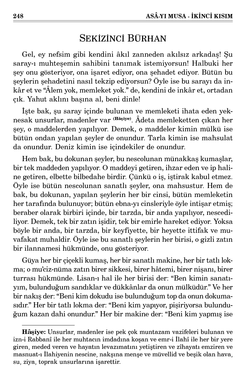 Hem bak, bu dokunan şeyler, bu nescolunan münakkaş kumaşlar, bir tek maddeden yapılıyor. O maddeyi getiren, ihzar eden ve ip haline getiren, elbette bilbedahe birdir. Çünkü o iş, iştirak kabul etmez. Öyle ise bütün nescolunan sanatlı şeyler, ona mahsustur. Hem de bak, bu dokunan, yapılan şeylerin her bir cinsi, bütün memleketin her tarafında bulunuyor; bütün ebna-yı cinsleriyle öyle intişar etmiş; beraber olarak birbiri içinde, bir tarzda, bir anda yapılıyor, nescediliyor. Demek, tek bir zatın işidir, tek bir emirle hareket ediyor. Yoksa böyle bir anda, bir tarzda, bir keyfiyette, bir heyette ittifak ve muvafakat muhaldir. Öyle ise bu sanatlı şeylerin her birisi, o gizli zatın bir ilannamesi hükmünde, onu gösteriyor.