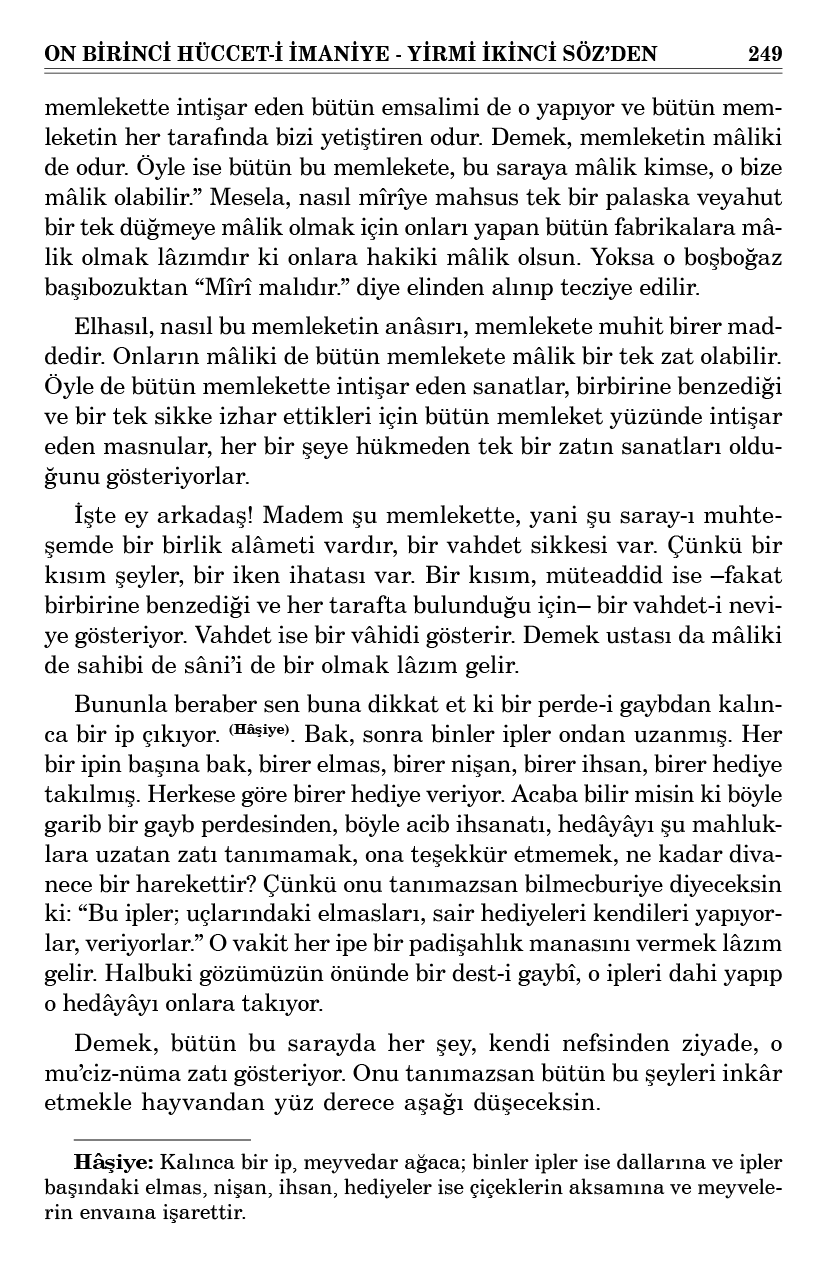 Güya her bir çiçekli kumaş, her bir sanatlı makine, her bir tatlı lokma; o mu’ciz-nüma zatın birer sikkesi, birer hâtemi, birer nişanı, birer turrası hükmünde. Lisan-ı hal ile her birisi der: “Ben kimin sanatıyım, bulunduğum sandıklar ve dükkânlar da onun mülküdür.” Ve her bir nakış der: “Beni kim dokudu ise bulunduğum top da onun dokumasıdır.” Her bir tatlı lokma der: “Beni kim yapıyor, pişiriyorsa bulunduğum kazan dahi onundur.” Her bir makine der: “Beni kim yapmış ise