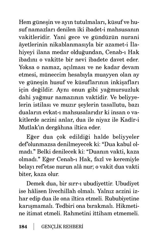 Hem güneşin ve ayın tutulmaları, küsuf ve husuf namazları denilen iki ibadet-i mahsusanın vakitleridir. Yani gece ve gündüzün nurani âyetlerinin nikablanmasıyla bir azamet-i İlahiyeyi ilana medar olduğundan, Cenab-ı Hak ibadını o vakitte bir nevi ibadete davet eder. Yoksa o namaz, açılması ve ne kadar devam etmesi, müneccim hesabıyla muayyen olan ay ve güneşin husuf ve küsuflarının inkişafları için değildir. Aynı onun gibi yağmursuzluk dahi yağmur namazının vaktidir. Ve beliyyelerin istilası ve muzır şeylerin tasallutu, bazı duaların evkat-ı mahsusalarıdır ki insan o vakitlerde aczini anlar, dua ile niyaz ile Kadîr-i Mutlak’ın dergâhına iltica eder.