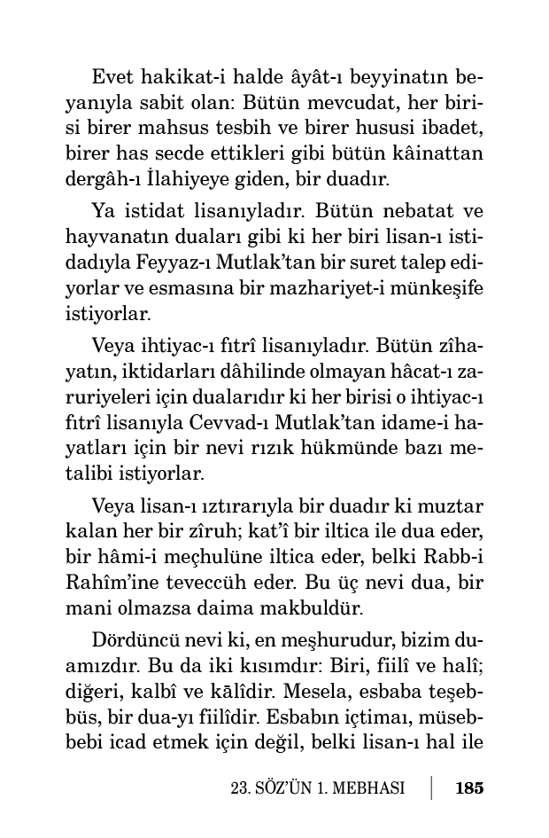 Demek dua, bir sırr-ı ubudiyettir. Ubudiyet ise hâlisen livechillah olmalı. Yalnız aczini izhar edip dua ile ona iltica etmeli. Rububiyetine karışmamalı. Tedbiri ona bırakmalı. Hikmetine itimat etmeli. Rahmetini ittiham etmemeli.