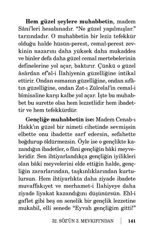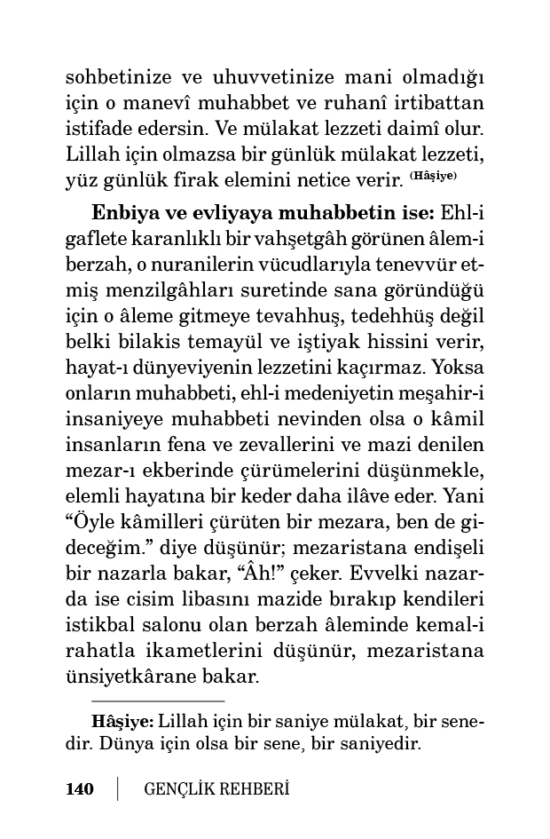 Enbiya ve evliyaya muhabbetin ise: Ehl-i gaflete karanlıklı bir vahşetgâh görünen âlem-i berzah, o nuranilerin vücudlarıyla tenevvür etmiş menzilgâhları suretinde sana göründüğü için o âleme gitmeye tevahhuş, tedehhüş değil belki bilakis temayül ve iştiyak hissini verir, hayat-ı dünyeviyenin lezzetini kaçırmaz. Yoksa onların muhabbeti, ehl-i medeniyetin meşahir-i insaniyeye muhabbeti nevinden olsa o kâmil insanların fena ve zevallerini ve mazi denilen mezar-ı ekberinde çürümelerini düşünmekle, elemli hayatına bir keder daha ilâve eder. Yani “Öyle kâmilleri çürüten bir mezara, ben de gideceğim.” diye düşünür; mezaristana endişeli bir nazarla bakar, “Âh!” çeker. Evvelki nazarda ise cisim libasını mazide bırakıp kendileri istikbal salonu olan berzah âleminde kemal-i rahatla ikametlerini düşünür, mezaristana ünsiyetkârane bakar.