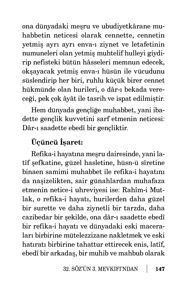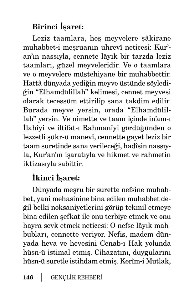 Leziz taamlara, hoş meyvelere şâkirane muhabbet-i meşruanın uhrevî neticesi: Kur’an’ın nassıyla, cennete lâyık bir tarzda leziz taamları, güzel meyveleridir. Ve o taamlara ve o meyvelere müştehiyane bir muhabbettir. Hattâ dünyada yediğin meyve üstünde söylediğin “Elhamdülillah” kelimesi, cennet meyvesi olarak tecessüm ettirilip sana takdim edilir. Burada meyve yersin, orada “Elhamdülillah” yersin. Ve nimette ve taam içinde in’am-ı İlahîyi ve iltifat-ı Rahmanîyi gördüğünden o lezzetli şükr-ü manevî, cennette gayet leziz bir taam suretinde sana verileceği, hadîsin nassıyla, Kur’an’ın işaratıyla ve hikmet ve rahmetin iktizasıyla sabittir.
