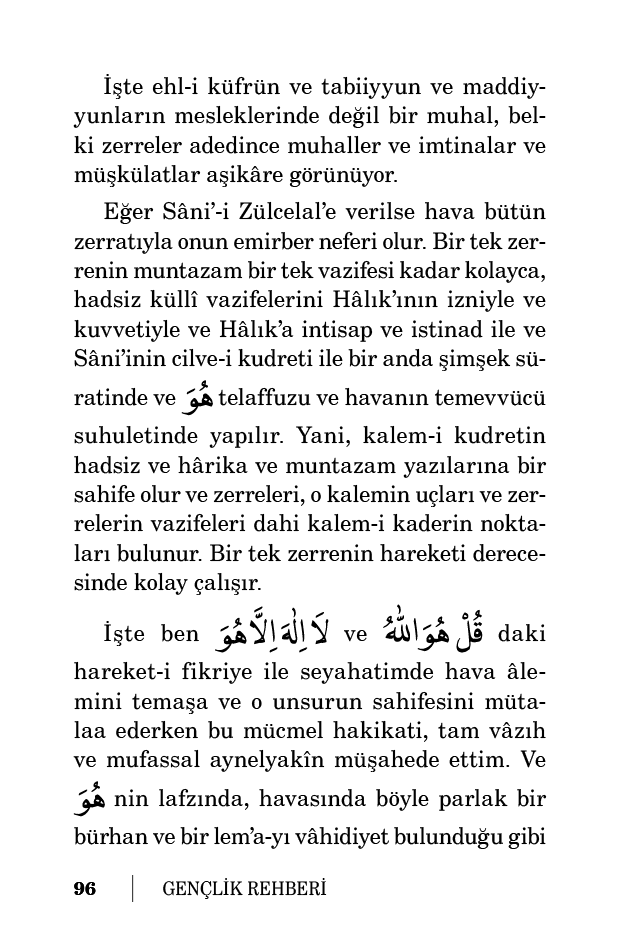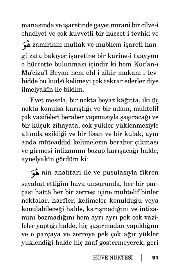 İşte ben لَا اِلٰهَ اِلَّا هُوَ ve قُلْ هُوَ اللّٰهُ daki hareket-i fikriye ile seyahatimde hava âlemini temaşa ve o unsurun sahifesini mütalaa ederken bu mücmel hakikati, tam vâzıh ve mufassal aynelyakîn müşahede ettim. Ve هُوَ nin lafzında, havasında böyle parlak bir bürhan ve bir lem’a-yı vâhidiyet bulunduğu gibi