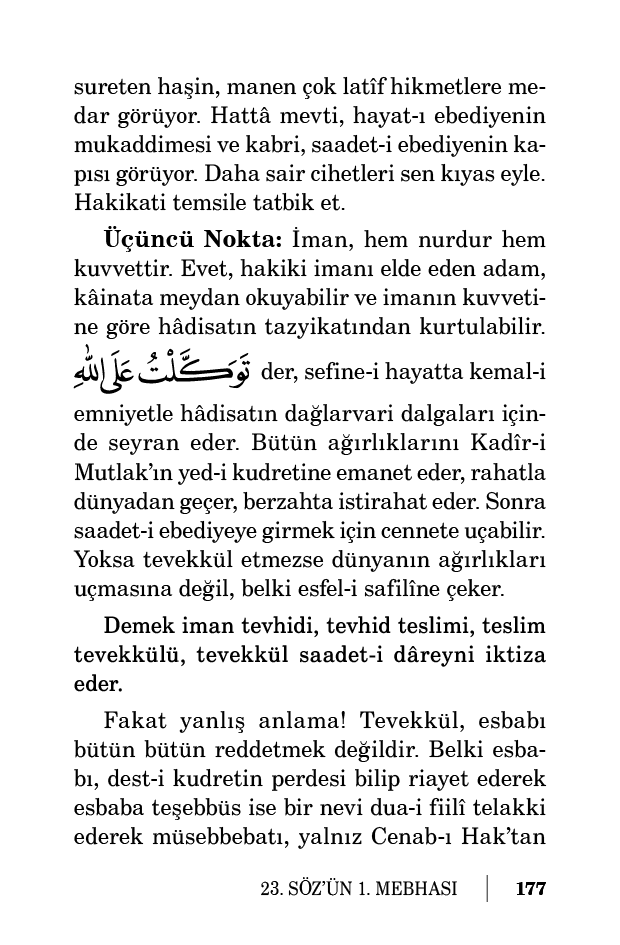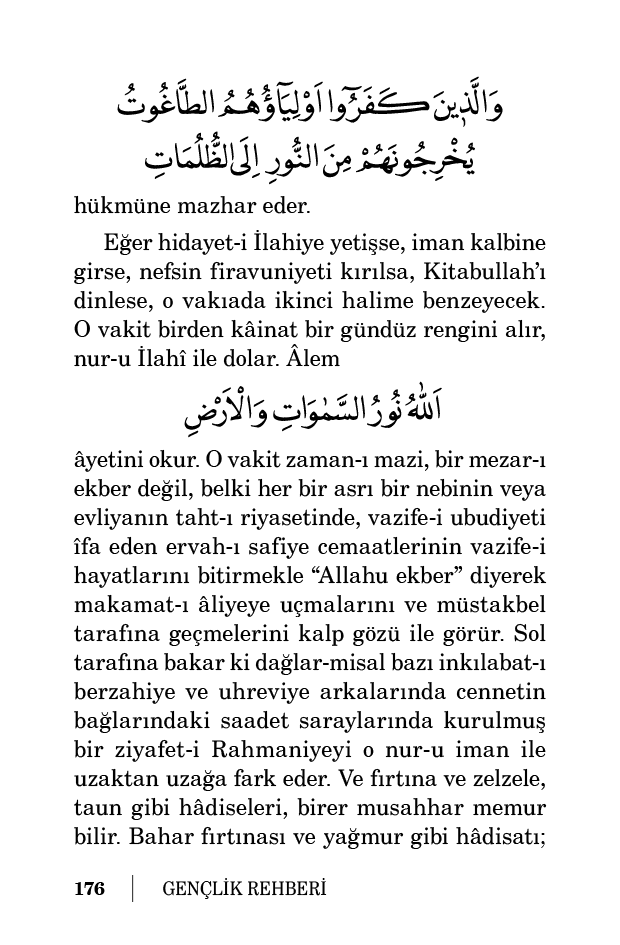âyetini okur. O vakit zaman-ı mazi, bir mezar-ı ekber değil, belki her bir asrı bir nebinin veya evliyanın taht-ı riyasetinde, vazife-i ubudiyeti îfa eden ervah-ı safiye cemaatlerinin vazife-i hayatlarını bitirmekle “Allahu ekber” diyerek makamat-ı âliyeye uçmalarını ve müstakbel tarafına geçmelerini kalp gözü ile görür. Sol tarafına bakar ki dağlar-misal bazı inkılabat-ı berzahiye ve uhreviye arkalarında cennetin bağlarındaki saadet saraylarında kurulmuş bir ziyafet-i Rahmaniyeyi o nur-u iman ile uzaktan uzağa fark eder. Ve fırtına ve zelzele, taun gibi hâdiseleri, birer musahhar memur bilir. Bahar fırtınası ve yağmur gibi hâdisatı;