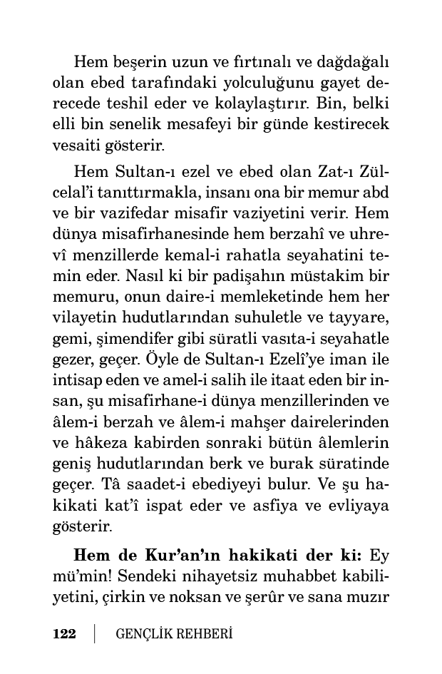 Hem Sultan-ı ezel ve ebed olan Zat-ı Zülcelal’i tanıttırmakla, insanı ona bir memur abd ve bir vazifedar misafir vaziyetini verir. Hem dünya misafirhanesinde hem berzahî ve uhrevî menzillerde kemal-i rahatla seyahatini temin eder. Nasıl ki bir padişahın müstakim bir memuru, onun daire-i memleketinde hem her vilayetin hudutlarından suhuletle ve tayyare, gemi, şimendifer gibi süratli vasıta-i seyahatle gezer, geçer. Öyle de Sultan-ı Ezelî’ye iman ile intisap eden ve amel-i salih ile itaat eden bir insan, şu misafirhane-i dünya menzillerinden ve âlem-i berzah ve âlem-i mahşer dairelerinden ve hâkeza kabirden sonraki bütün âlemlerin geniş hudutlarından berk ve burak süratinde geçer. Tâ saadet-i ebediyeyi bulur. Ve şu hakikati kat’î ispat eder ve asfiya ve evliyaya gösterir.
