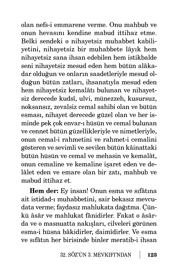 Hem de Kur’an’ın hakikati der ki: Ey mü’min! Sendeki nihayetsiz muhabbet kabiliyetini, çirkin ve noksan ve şerûr ve sana muzır