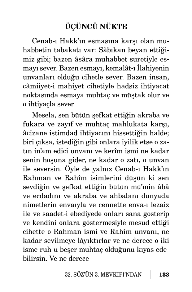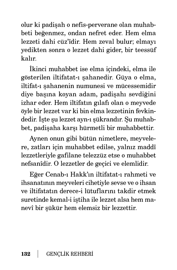 Aynen onun gibi bütün nimetlere, meyvelere, zatları için muhabbet edilse, yalnız maddî lezzetleriyle gafilane telezzüz etse o muhabbet nefsanîdir. O lezzetler de geçici ve elemlidir. Eğer Cenab-ı Hakk’ın iltifatat-ı rahmeti ve ihsanatının meyveleri cihetiyle sevse ve o ihsan ve iltifatatın derece-i lütuflarını takdir etmek suretinde kemal-i iştiha ile lezzet alsa hem manevî bir şükür hem elemsiz bir lezzettir.