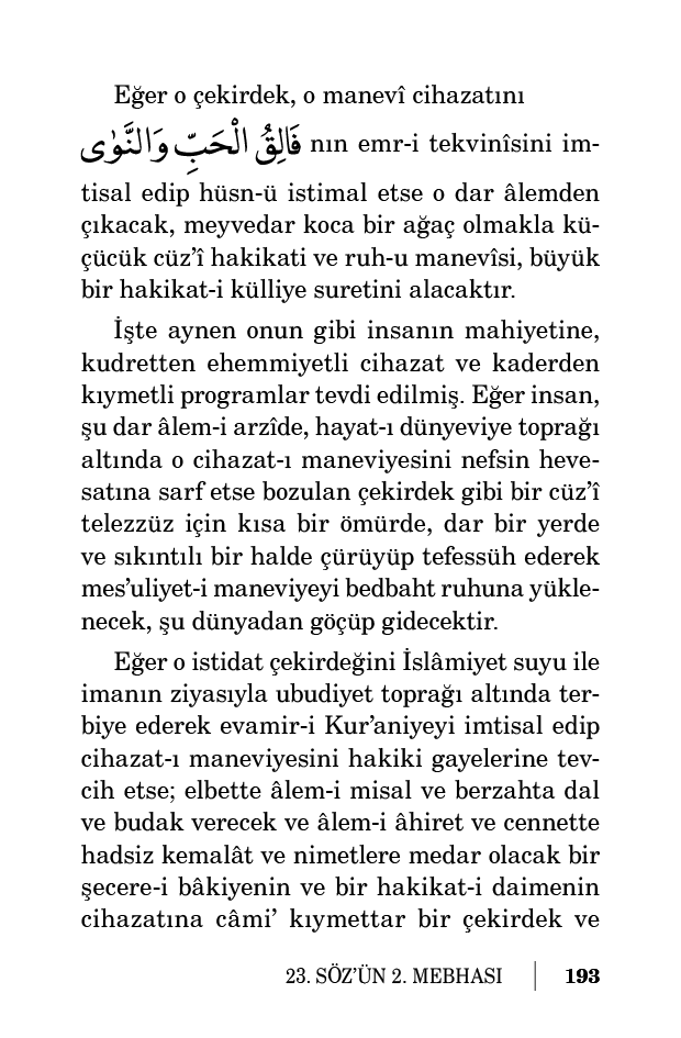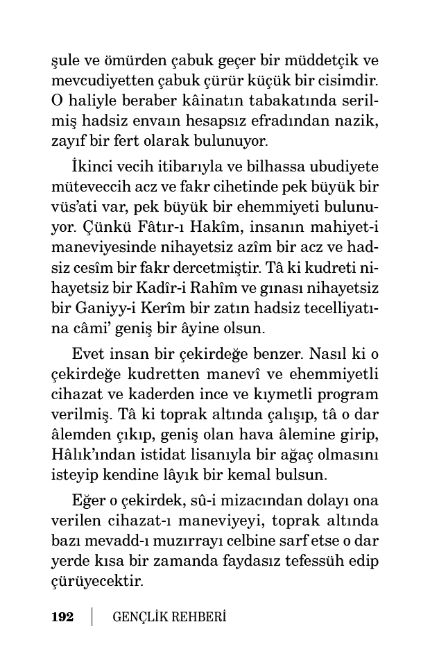 Evet insan bir çekirdeğe benzer. Nasıl ki o çekirdeğe kudretten manevî ve ehemmiyetli cihazat ve kaderden ince ve kıymetli program verilmiş. Tâ ki toprak altında çalışıp, tâ o dar âlemden çıkıp, geniş olan hava âlemine girip, Hâlık’ından istidat lisanıyla bir ağaç olmasını isteyip kendine lâyık bir kemal bulsun.