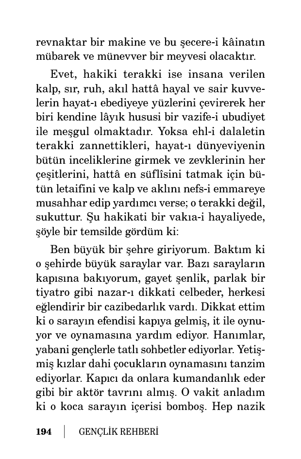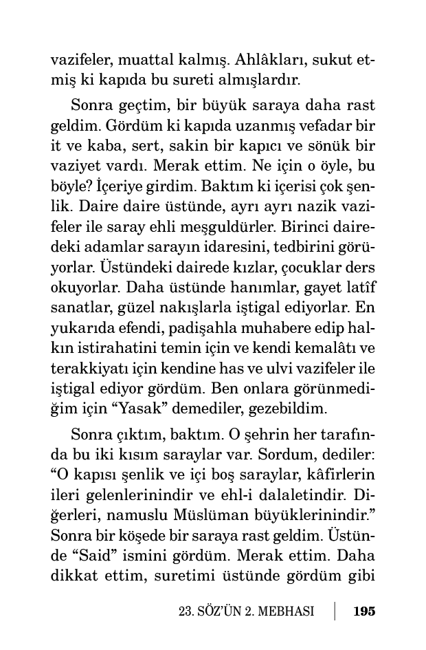 Ben büyük bir şehre giriyorum. Baktım ki o şehirde büyük saraylar var. Bazı sarayların kapısına bakıyorum, gayet şenlik, parlak bir tiyatro gibi nazar-ı dikkati celbeder, herkesi eğlendirir bir cazibedarlık vardı. Dikkat ettim ki o sarayın efendisi kapıya gelmiş, it ile oynuyor ve oynamasına yardım ediyor. Hanımlar, yabani gençlerle tatlı sohbetler ediyorlar. Yetişmiş kızlar dahi çocukların oynamasını tanzim ediyorlar. Kapıcı da onlara kumandanlık eder gibi bir aktör tavrını almış. O vakit anladım ki o koca sarayın içerisi bomboş. Hep nazik