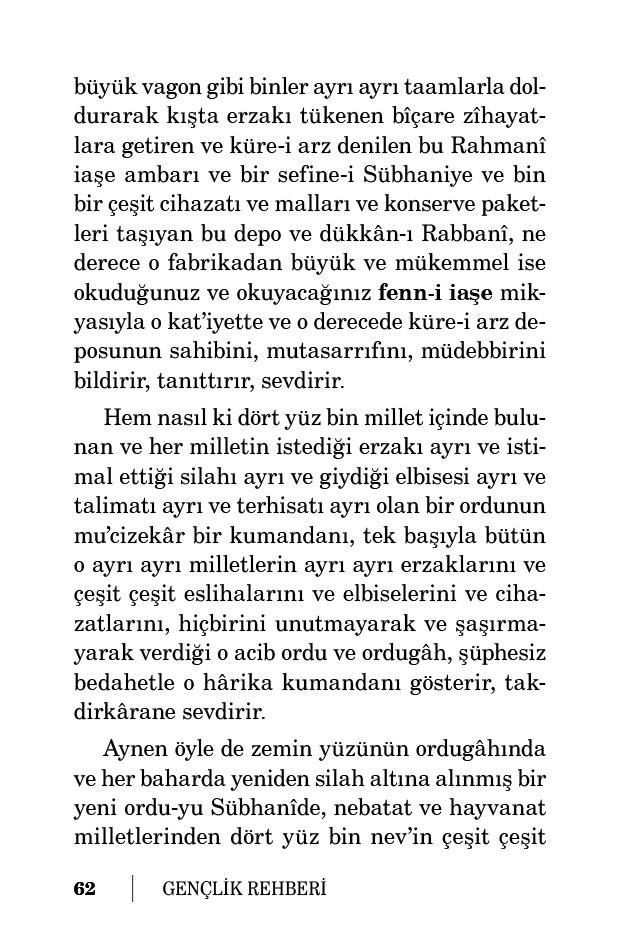 büyük vagon gibi binler ayrı ayrı taamlarla doldurarak kışta erzakı tükenen bîçare zîhayatlara getiren ve küre-i arz denilen bu Rahmanî iaşe ambarı ve bir sefine-i Sübhaniye ve bin bir çeşit cihazatı ve malları ve konserve paketleri taşıyan bu depo ve dükkân-ı Rabbanî, ne derece o fabrikadan büyük ve mükemmel ise okuduğunuz ve okuyacağınız fenn-i iaşe mikyasıyla o kat’iyette ve o derecede küre-i arz deposunun sahibini, mutasarrıfını, müdebbirini bildirir, tanıttırır, sevdirir.