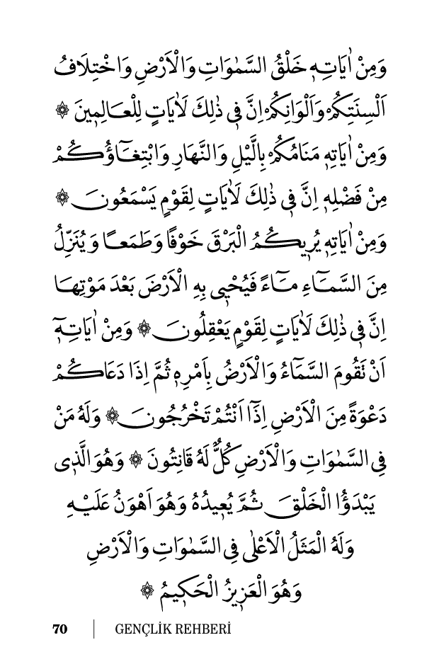 وَمِنْ اٰيَاتِهٖ خَلْقُ السَّمٰوَاتِ وَالْاَرْضِ وَاخْتِلَافُ اَلْسِنَتِكُمْ وَاَلْوَانِكُمْ اِنَّ فٖى ذٰلِكَ لَاٰيَاتٍ لِلْعَالِمٖينَ ۞ وَمِنْ اٰيَاتِهٖ مَنَامُكُمْ بِالَّيْلِ وَالنَّهَارِ وَابْتِغَٓاؤُكُمْ مِنْ فَضْلِهٖ اِنَّ فٖى ذٰلِكَ لَاٰيَاتٍ لِقَوْمٍ يَسْمَعُونَ ۞ وَمِنْ اٰيَاتِهٖ يُرٖيكُمُ الْبَرْقَ خَوْفًا وَطَمَعًا وَيُنَزِّلُ مِنَ السَّمَٓاءِ مَٓاءً فَيُحْيٖى بِهِ الْاَرْضَ بَعْدَ مَوْتِهَا اِنَّ فٖى ذٰلِكَ لَاٰيَاتٍ لِقَوْمٍ يَعْقِلُونَ ۞ وَمِنْ اٰيَاتِهٖٓ اَنْ تَقُومَ السَّمَٓاءُ وَالْاَرْضُ بِاَمْرِهٖ ثُمَّ اِذَا دَعَاكُمْ دَعْوَةً مِنَ الْاَرْضِ اِذَٓا اَنْتُمْ تَخْرُجُونَ ۞ وَلَهُ مَنْ فِى السَّمٰوَاتِ وَالْاَرْضِ كُلٌّ لَهُ قَانِتُونَ ۞ وَهُوَ الَّذٖى يَبْدَؤُا الْخَلْقَ ثُمَّ يُعٖيدُهُ وَهُوَ اَهْوَنُ عَلَيْهِ وَلَهُ الْمَثَلُ الْاَعْلٰى فِى السَّمٰوَاتِ وَالْاَرْضِ وَهُوَ الْعَزٖيزُ الْحَكٖيمُ ۞