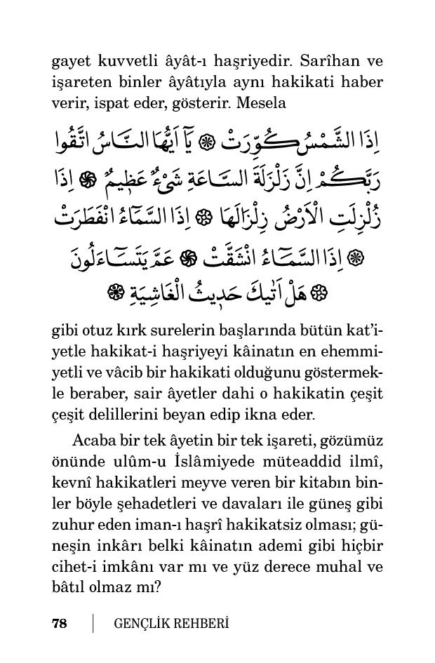 gibi otuz kırk surelerin başlarında bütün kat’iyetle hakikat-i haşriyeyi kâinatın en ehemmiyetli ve vâcib bir hakikati olduğunu göstermekle beraber, sair âyetler dahi o hakikatin çeşit çeşit delillerini beyan edip ikna eder.