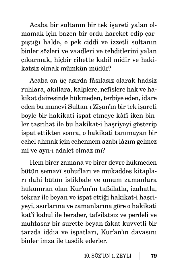 Acaba bir tek âyetin bir tek işareti, gözümüz önünde ulûm-u İslâmiyede müteaddid ilmî, kevnî hakikatleri meyve veren bir kitabın binler böyle şehadetleri ve davaları ile güneş gibi zuhur eden iman-ı haşrî hakikatsiz olması; güneşin inkârı belki kâinatın ademi gibi hiçbir cihet-i imkânı var mı ve yüz derece muhal ve bâtıl olmaz mı?