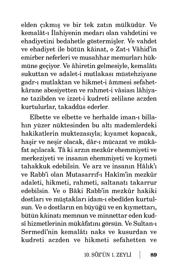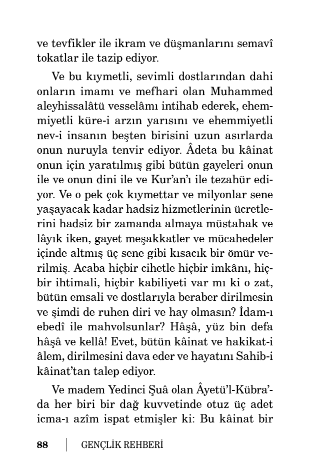 Ve o pek çok kıymettar ve milyonlar sene yaşayacak kadar hadsiz hizmetlerinin ücretlerini hadsiz bir zamanda almaya müstahak ve lâyık iken, gayet meşakkatler ve mücahedeler içinde altmış üç sene gibi kısacık bir ömür verilmiş. Acaba hiçbir cihetle hiçbir imkânı, hiçbir ihtimali, hiçbir kabiliyeti var mı ki o zat, bütün emsali ve dostlarıyla beraber dirilmesin ve şimdi de ruhen diri ve hay olmasın? İdam-ı ebedî ile mahvolsunlar? Hâşâ, yüz bin defa hâşâ ve kellâ! Evet, bütün kâinat ve hakikat-i âlem, dirilmesini dava eder ve hayatını Sahib-i kâinat’tan talep ediyor.
