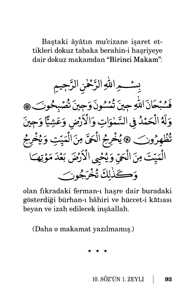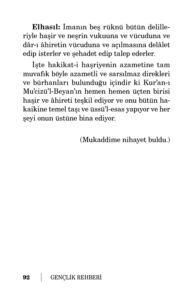 İşte hakikat-i haşriyenin azametine tam muvafık böyle azametli ve sarsılmaz direkleri ve bürhanları bulunduğu içindir ki Kur’an-ı Mu’cizü’l-Beyan’ın hemen hemen üçten birisi haşir ve âhireti teşkil ediyor ve onu bütün hakaikine temel taşı ve üssü’l-esas yapıyor ve her şeyi onun üstüne bina ediyor.