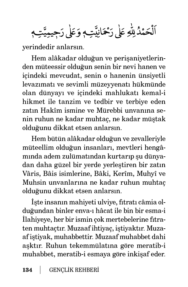 İşte insanın mahiyeti ulviye, fıtratı câmia olduğundan binler enva-ı hâcat ile bin bir esma-i İlahiyeye, her bir ismin çok mertebelerine fıtraten muhtaçtır. Muzaaf ihtiyaç, iştiyaktır. Muzaaf iştiyak, muhabbettir. Muzaaf muhabbet dahi aşktır. Ruhun tekemmülatına göre meratib-i muhabbet, meratib-i esmaya göre inkişaf eder.