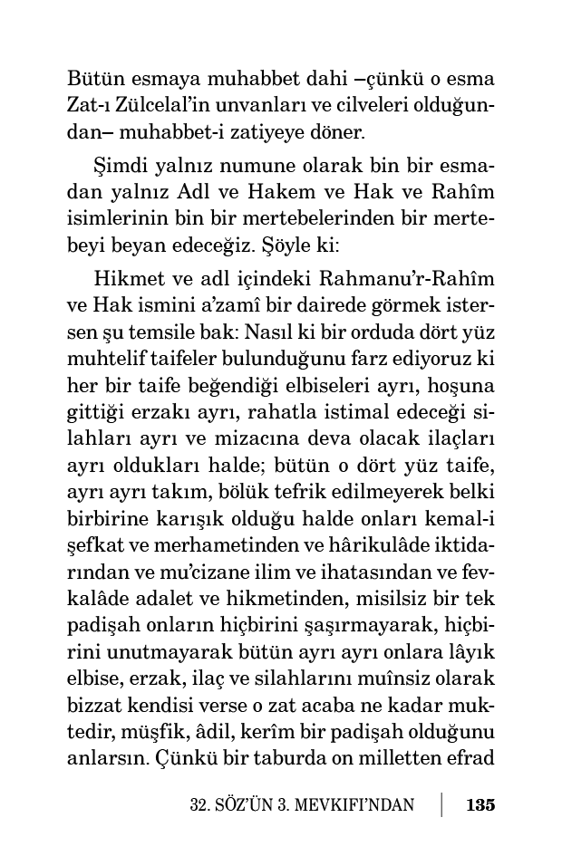 Hem alâkadar olduğun ve perişaniyetlerinden müteessir olduğun senin bir nevi hanen ve içindeki mevcudat, senin o hanenin ünsiyetli levazımatı ve sevimli müzeyyenatı hükmünde olan dünyayı ve içindeki mahlukatı kemal-i hikmet ile tanzim ve tedbir ve terbiye eden zatın Hakîm ismine ve Mürebbi unvanına senin ruhun ne kadar muhtaç, ne kadar müştak olduğunu dikkat etsen anlarsın.
