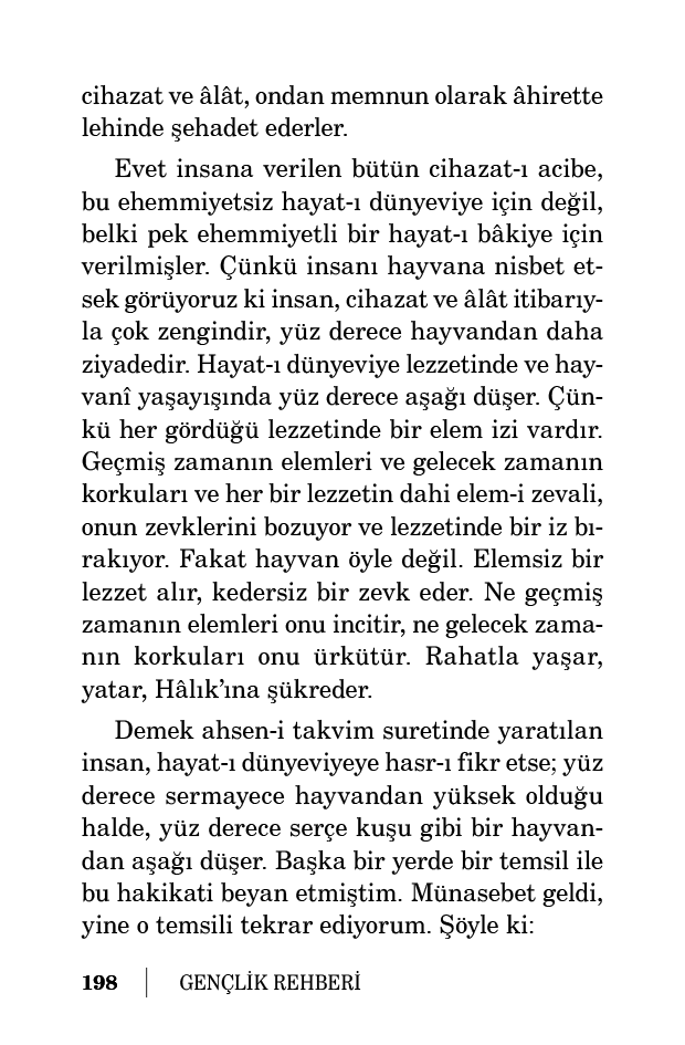 Evet insana verilen bütün cihazat-ı acibe, bu ehemmiyetsiz hayat-ı dünyeviye için değil, belki pek ehemmiyetli bir hayat-ı bâkiye için verilmişler. Çünkü insanı hayvana nisbet etsek görüyoruz ki insan, cihazat ve âlât itibarıyla çok zengindir, yüz derece hayvandan daha ziyadedir. Hayat-ı dünyeviye lezzetinde ve hayvanî yaşayışında yüz derece aşağı düşer. Çünkü her gördüğü lezzetinde bir elem izi vardır. Geçmiş zamanın elemleri ve gelecek zamanın korkuları ve her bir lezzetin dahi elem-i zevali, onun zevklerini bozuyor ve lezzetinde bir iz bırakıyor. Fakat hayvan öyle değil. Elemsiz bir lezzet alır, kedersiz bir zevk eder. Ne geçmiş zamanın elemleri onu incitir, ne gelecek zamanın korkuları onu ürkütür. Rahatla yaşar, yatar, Hâlık’ına şükreder.