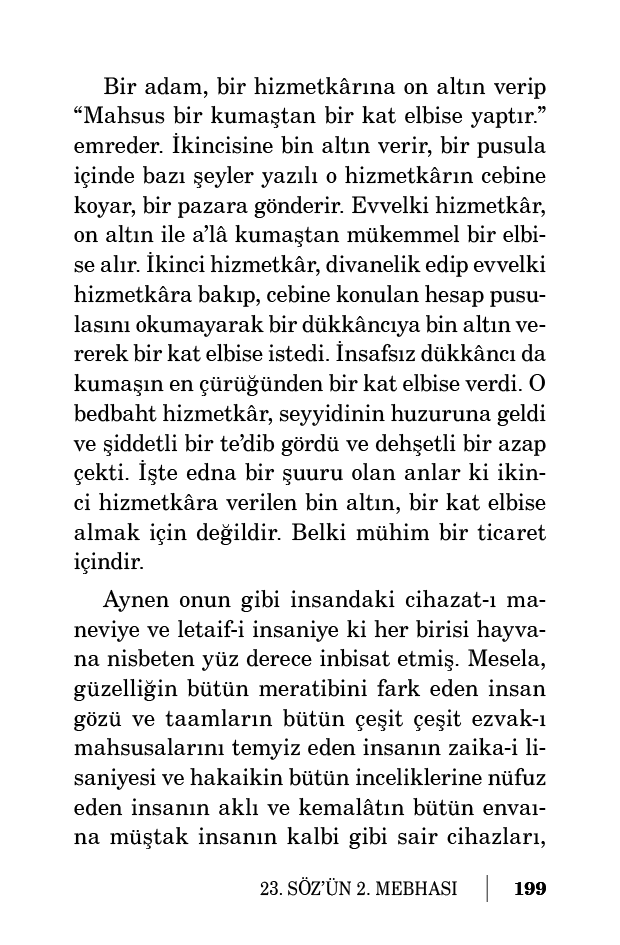 Demek ahsen-i takvim suretinde yaratılan insan, hayat-ı dünyeviyeye hasr-ı fikr etse; yüz derece sermayece hayvandan yüksek olduğu halde, yüz derece serçe kuşu gibi bir hayvandan aşağı düşer. Başka bir yerde bir temsil ile bu hakikati beyan etmiştim. Münasebet geldi, yine o temsili tekrar ediyorum. Şöyle ki: