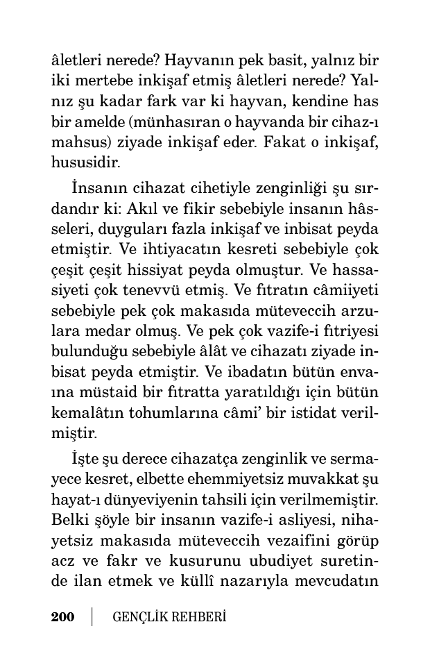 İnsanın cihazat cihetiyle zenginliği şu sırdandır ki: Akıl ve fikir sebebiyle insanın hâsseleri, duyguları fazla inkişaf ve inbisat peyda etmiştir. Ve ihtiyacatın kesreti sebebiyle çok çeşit çeşit hissiyat peyda olmuştur. Ve hassasiyeti çok tenevvü etmiş. Ve fıtratın câmiiyeti sebebiyle pek çok makasıda müteveccih arzulara medar olmuş. Ve pek çok vazife-i fıtriyesi bulunduğu sebebiyle âlât ve cihazatı ziyade inbisat peyda etmiştir. Ve ibadatın bütün envaına müstaid bir fıtratta yaratıldığı için bütün kemalâtın tohumlarına câmi’ bir istidat verilmiştir.