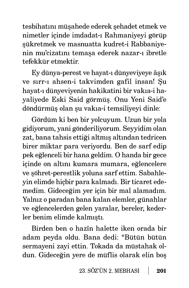 İşte şu derece cihazatça zenginlik ve sermayece kesret, elbette ehemmiyetsiz muvakkat şu hayat-ı dünyeviyenin tahsili için verilmemiştir. Belki şöyle bir insanın vazife-i asliyesi, nihayetsiz makasıda müteveccih vezaifini görüp acz ve fakr ve kusurunu ubudiyet suretinde ilan etmek ve küllî nazarıyla mevcudatın