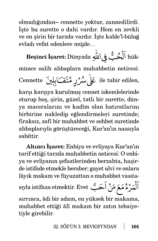 Beşinci İşaret: Dünyada اَلْحُبُّ فِى اللّٰهِ hükmünce salih ahbaplara muhabbetin neticesi: Cennette عَلٰى سُرُرٍ مُتَقَابِلٖينَ ile tabir edilen, karşı karşıya kurulmuş cennet iskemlelerinde oturup hoş, şirin, güzel, tatlı bir surette, dünya maceralarını ve kadîm olan hatıratlarını birbirine nakledip eğlendirmeleri suretinde; firaksız, safi bir muhabbet ve sohbet suretinde ahbaplarıyla görüştüreceği, Kur’an’ın nassıyla sabittir.