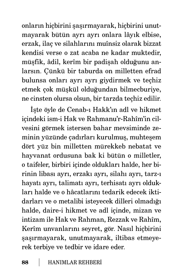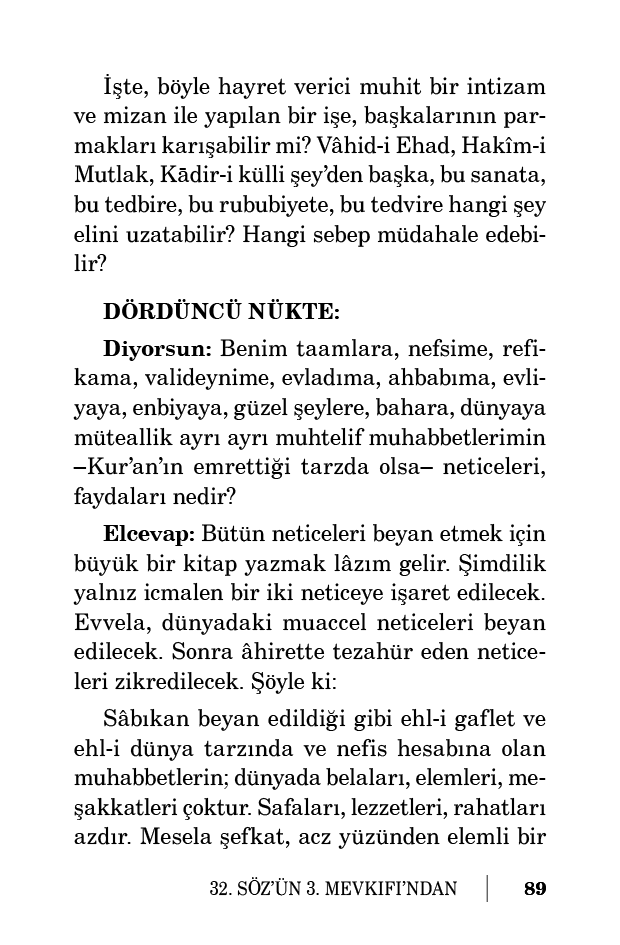 İşte, böyle hayret verici muhit bir intizam ve mizan ile yapılan bir işe, başkalarının parmakları karışabilir mi? Vâhid-i Ehad ve Hakîm-i Mutlak, Kādir-i külli şey’den başka, bu sanata, bu tedbire, bu rububiyete, bu tedvire hangi şey elini uzatabilir? Hangi sebep müdahale edebilir?