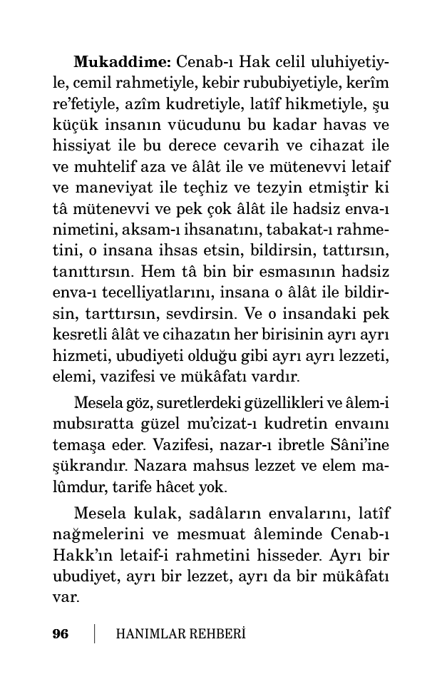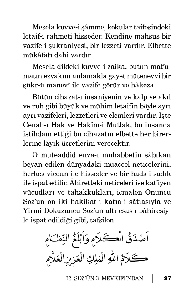 Bütün cihazat-ı insaniyenin ve kalp ve akıl ve ruh gibi büyük ve mühim letaifin böyle ayrı ayrı vazifeleri, lezzetleri ve elemleri vardır. İşte Cenab-ı Hak ve Hakîm-i Mutlak, bu insanda istihdam ettiği bu cihazatın elbette her birerlerine lâyık ücretlerini verecektir.