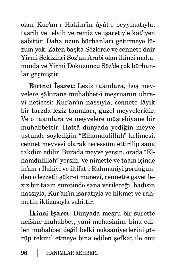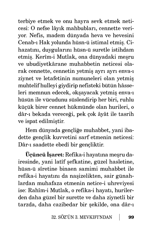 Üçüncü İşaret: Refika-i hayatına meşru dairesinde, yani latîf şefkatine, güzel hasletine, hüsn-ü sîretine binaen samimi muhabbet ile refika-i hayatını da naşizelikten, sair günahlardan muhafaza etmenin netice-i uhreviyesi ise: Rahîm-i Mutlak, o refika-i hayatı, hurilerden daha güzel bir surette ve daha ziynetli bir tarzda, daha cazibedar bir şekilde, ona dâr-ı