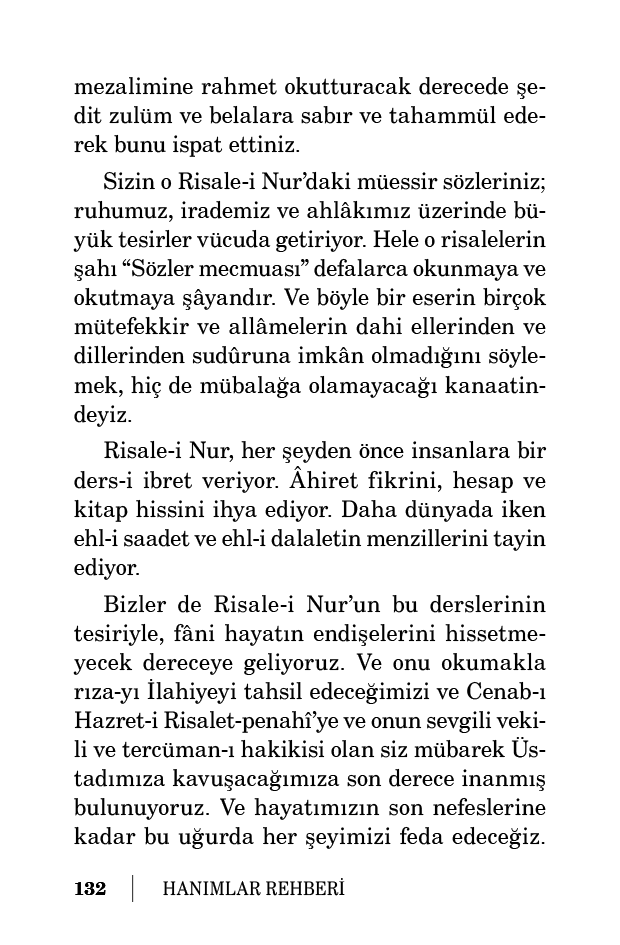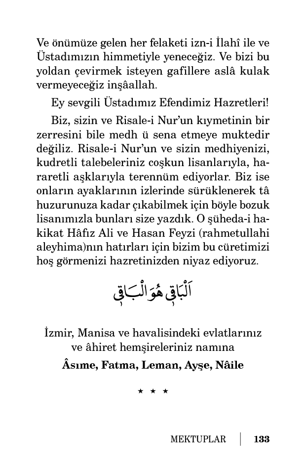 Biz, sizin ve Risale-i Nur’un kıymetinin bir zerresini bile medh ü sena etmeye muktedir değiliz. Risale-i Nur’un ve sizin medhiyenizi, kudretli talebeleriniz coşkun lisanlarıyla, hararetli aşklarıyla terennüm ediyorlar. Biz ise onların ayaklarının izlerinde sürüklenerek tâ huzurunuza kadar çıkabilmek için böyle bozuk lisanımızla bunları size yazdık. O şüheda-i hakikat Hâfız Ali ve Hasan Feyzi (rahmetullahi aleyhima)nın hatırları için bizim bu cüretimizi hoş görmenizi hazretinizden niyaz ediyoruz.