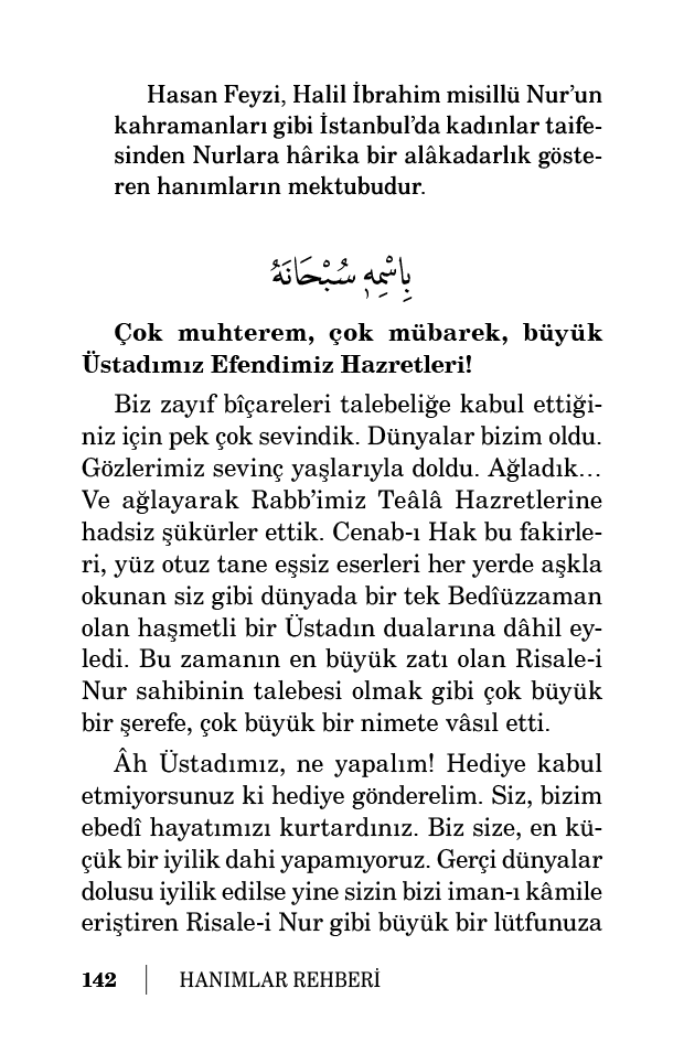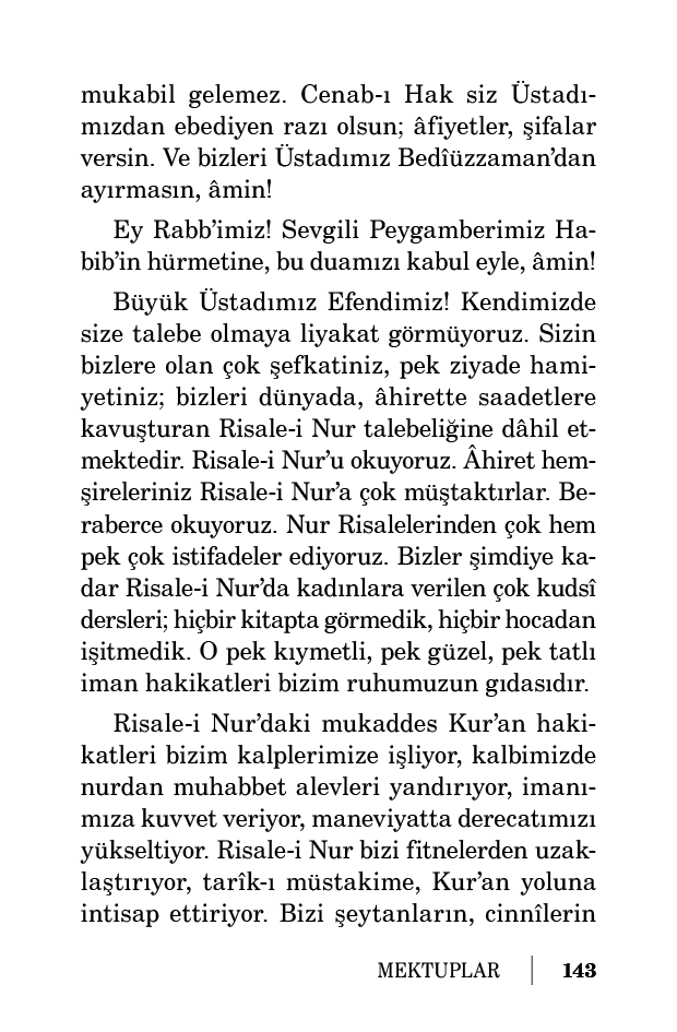 Büyük Üstadımız Efendimiz! Kendimizde size talebe olmaya liyakat görmüyoruz. Sizin bizlere olan çok şefkatiniz, pek ziyade hamiyetiniz; bizleri dünyada, âhirette saadetlere kavuşturan Risale-i Nur talebeliğine dâhil etmektedir. Risale-i Nur’u okuyoruz. Âhiret hemşireleriniz Risale-i Nur’a çok müştaktırlar. Beraberce okuyoruz. Nur Risalelerinden çok hem pek çok istifadeler ediyoruz. Bizler şimdiye kadar Risale-i Nur’da kadınlara verilen çok kudsî dersleri; hiçbir kitapta görmedik, hiçbir hocadan işitmedik. O pek kıymetli, pek güzel, pek tatlı iman hakikatleri bizim ruhumuzun gıdasıdır.