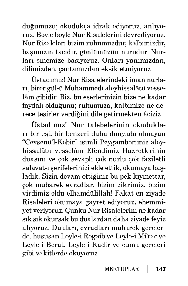 Üstadımız! Nur talebelerinin okudukları bir eşi, bir benzeri daha dünyada olmayan “Cevşenü’l-Kebir” isimli Peygamberimiz aleyhissalâtü vesselâm Efendimiz Hazretlerinin duasını ve çok sevaplı çok nurlu çok faziletli salavat-ı şerifelerinizi elde ettik, okumaya başladık. Sizin devam ettiğiniz bu pek kıymettar, çok mübarek evradlar; bizim zikrimiz, bizim virdimiz oldu elhamdülillah! Fakat en ziyade Risaleleri okumaya gayret ediyoruz, ehemmiyet veriyoruz. Çünkü Nur Risalelerini ne kadar sık sık okursak bu dualardan daha ziyade feyiz alıyoruz. Duaları, evradları mübarek gecelerde, hususan Leyle-i Regaib ve Leyle-i Mi’rac ve Leyle-i Berat, Leyle-i Kadir ve cuma geceleri gibi vakitlerde okuyoruz.