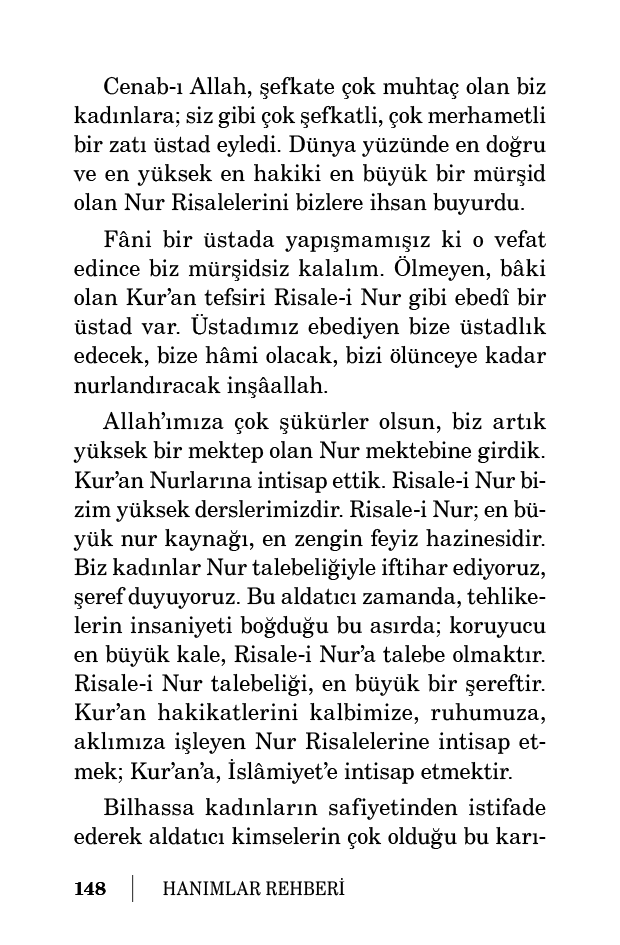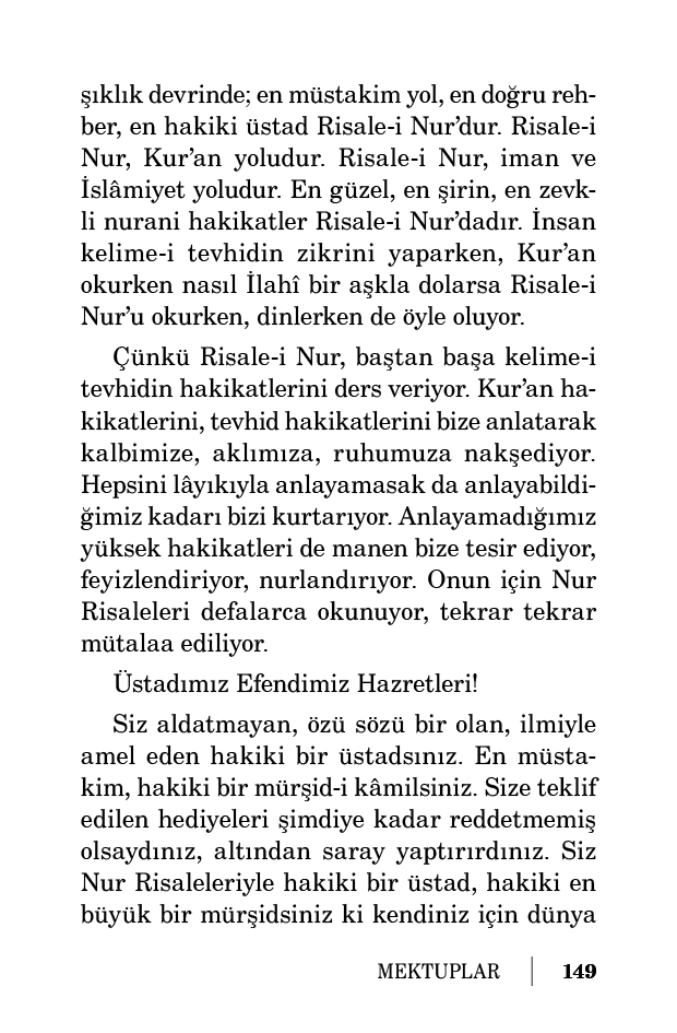 devrinde; en müstakim yol, en doğru rehber, en hakiki üstad Risale-i Nur’dur. Risale-i Nur, Kur’an yoludur. Risale-i Nur, iman ve İslâmiyet yoludur. En güzel, en şirin, en zevkli nurani hakikatler Risale-i Nur’dadır. İnsan kelime-i tevhidin zikrini yaparken, Kur’an okurken nasıl İlahî bir aşkla dolarsa Risale-i Nur’u okurken, dinlerken de öyle oluyor.