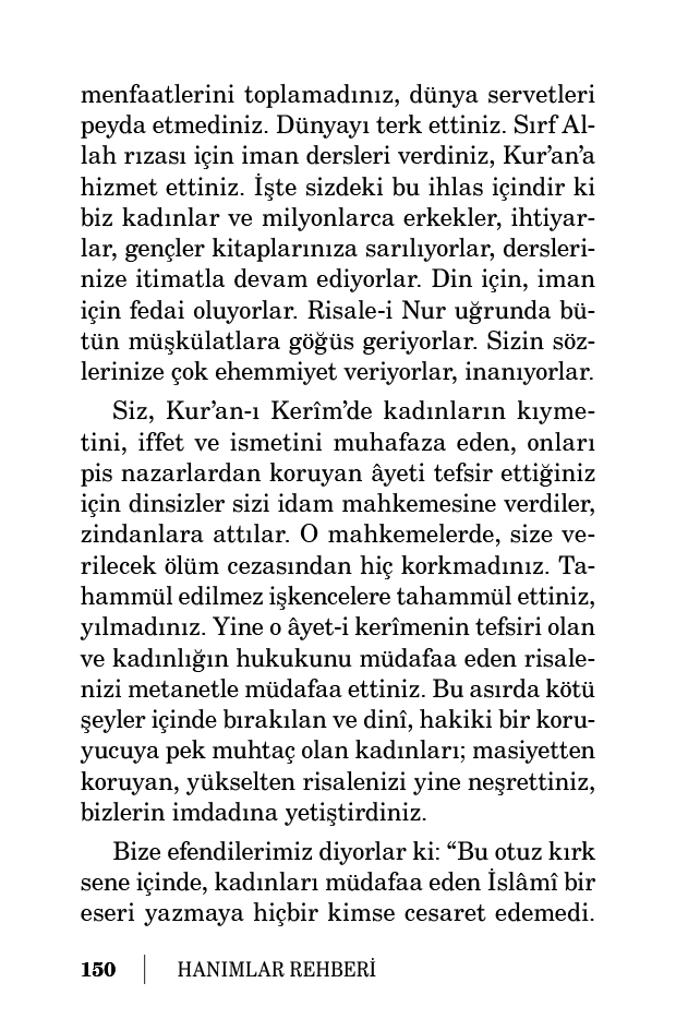 Böyle bir eseri, dinsizlerin işkenceleri içerisinde ancak Bedîüzzaman yazabildi. Kadınlık âlemine büyük bir rehber oldu.”