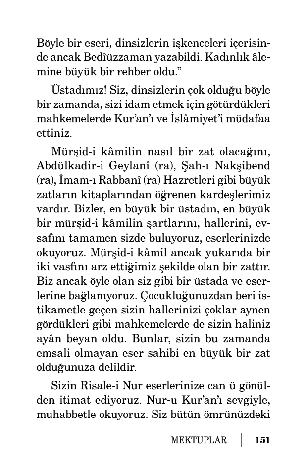 Mürşid-i kâmilin nasıl bir zat olacağını, Abdülkadir-i Geylanî (ra), Şah-ı Nakşibend (ra), İmam-ı Rabbanî (ra) Hazretleri gibi büyük zatların kitaplarından öğrenen kardeşlerimiz vardır. Bizler, en büyük bir üstadın, en büyük bir mürşid-i kâmilin şartlarını, hallerini, evsafını tamamen sizde buluyoruz, eserlerinizde okuyoruz. Mürşid-i kâmil ancak yukarıda bir iki vasfını arz ettiğimiz şekilde olan bir zattır. Biz ancak öyle olan siz gibi bir üstada ve eserlerine bağlanıyoruz. Çocukluğunuzdan beri istikametle geçen sizin hallerinizi çoklar aynen gördükleri gibi mahkemelerde de sizin haliniz ayân beyan oldu. Bunlar, sizin bu zamanda emsali olmayan eser sahibi en büyük bir zat olduğunuza delildir.