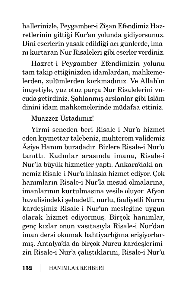 Biz bu dehşetli zamanda, Risale-i Nur’dan aldığımız derslerle imanı kazanmak gibi nihayetsiz bir saadete nâil olduğumuzdan dolayı kalbimize doğan şükranlarımızı işte bu suretle yazdık. Eğer elimizden gelse Risale-i Nur’un kadınlara ve bütün İslâm milletlerine verdiği