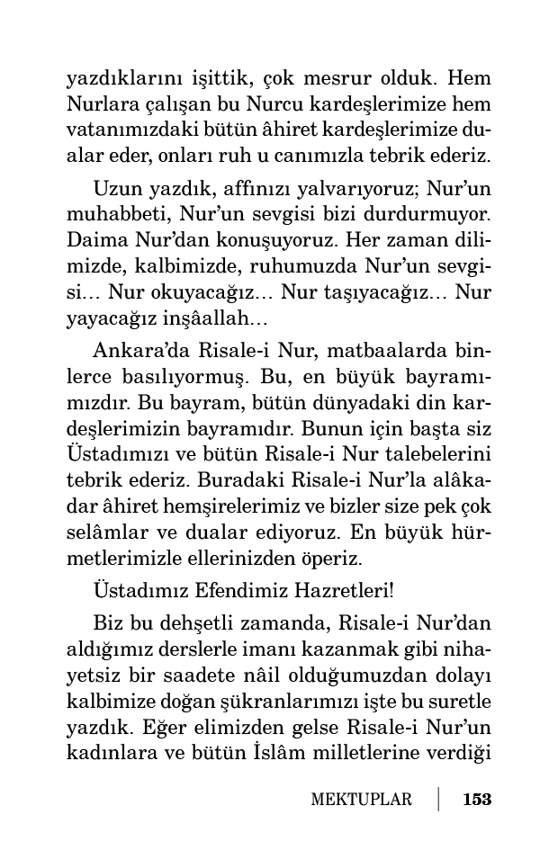 Ankara’da Risale-i Nur, matbaalarda binlerce basılıyormuş. Bu, en büyük bayramımızdır. Bu bayram, bütün dünyadaki din kardeşlerimizin bayramıdır. Bunun için başta siz Üstadımızı ve bütün Risale-i Nur talebelerini tebrik ederiz. Buradaki Risale-i Nur’la alâkadar âhiret hemşirelerimiz ve bizler size pek çok selâmlar ve dualar ediyoruz. En büyük hürmetlerimizle ellerinizden öperiz.