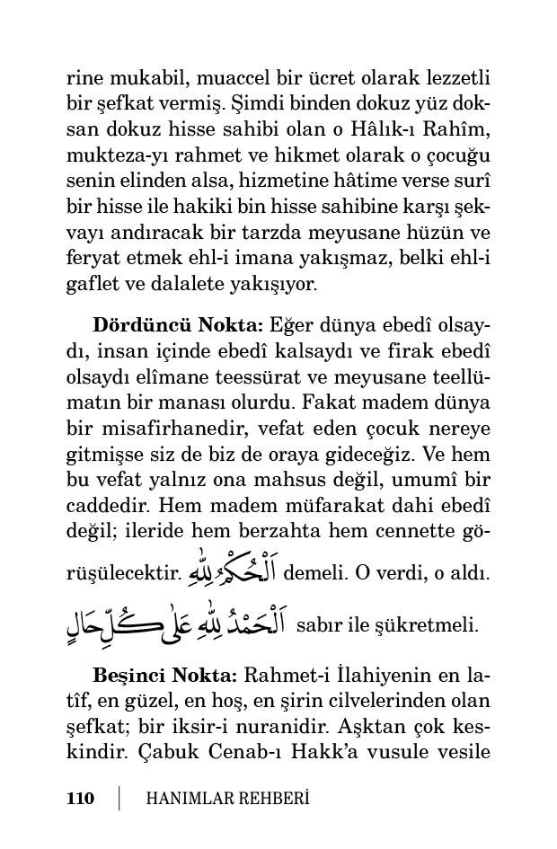 Gerek peder ve gerek valide, veledini bütün dünya gibi severler. Veledi elinden alındığı vakit, eğer bahtiyar ise hakiki ehl-i iman ise dünyadan yüzünü çevirir, Mün’im-i Hakiki’yi bulur. Der ki: “Dünya madem fânidir, değmiyor alâka-i kalbe.” Veledi nereye gitmişse oraya karşı bir alâka peyda eder, büyük manevî bir hal kazanır.