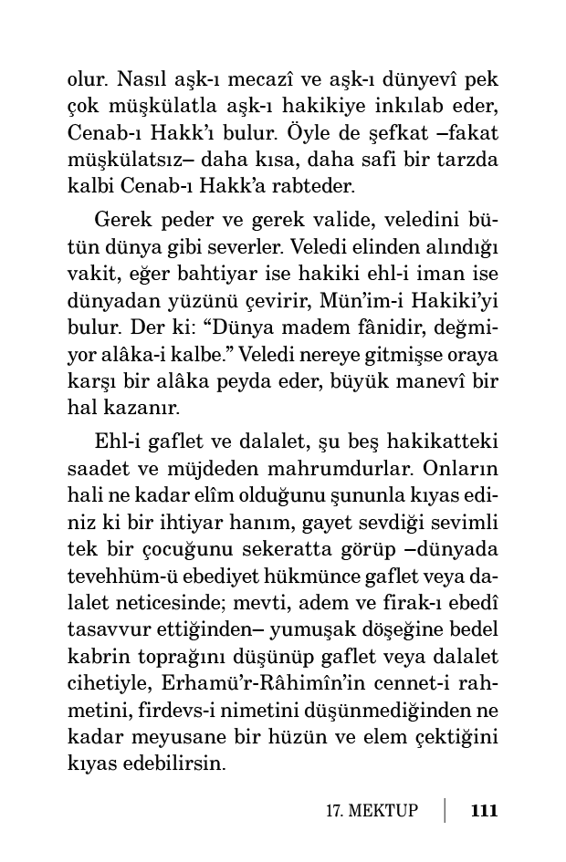 Ehl-i gaflet ve dalalet, şu beş hakikatteki saadet ve müjdeden mahrumdurlar. Onların hali ne kadar elîm olduğunu şununla kıyas ediniz ki bir ihtiyar hanım, gayet sevdiği sevimli tek bir çocuğunu sekeratta görüp –dünyada tevehhüm-ü ebediyet hükmünce gaflet veya dalalet neticesinde; mevti, adem ve firak-ı ebedî tasavvur ettiğinden– yumuşak döşeğine bedel kabrin toprağını düşünüp gaflet veya dalalet cihetiyle, Erhamü’r-Râhimîn’in cennet-i rahmetini, firdevs-i nimetini düşünmediğinden ne kadar meyusane bir hüzün ve elem çektiğini kıyas edebilirsin.