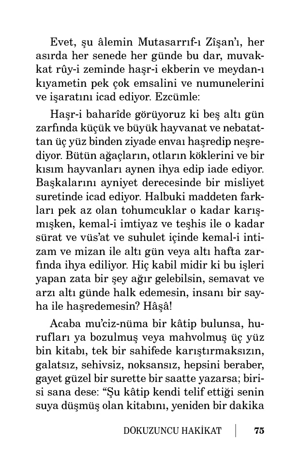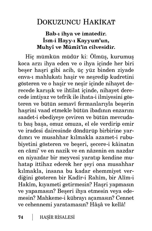 Hiç mümkün müdür ki: Ölmüş, kurumuş koca arzı ihya eden ve o ihya içinde her biri beşer haşri gibi acib, üç yüz binden ziyade enva-ı mahlukatı haşir ve neşredip kudretini gösteren ve o haşir ve neşir içinde nihayet derecede karışık ve ihtilat içinde, nihayet derecede imtiyaz ve tefrik ile ihata-i ilmiyesini gösteren ve bütün semavî fermanlarıyla beşerin haşrini vaad etmekle bütün ibadının enzarını saadet-i ebediyeye çeviren ve bütün mevcudatı baş başa, omuz omuza, el ele verdirip emir ve iradesi dairesinde döndürüp birbirine yardımcı ve musahhar kılmakla azamet-i rububiyetini gösteren ve beşeri, şecere-i kâinatın en câmi’ ve en nazik ve en nâzenin en nazdar en niyazdar bir meyvesi yaratıp kendine muhatap ittihaz ederek her şeyi ona musahhar kılmakla, insana bu kadar ehemmiyet verdiğini gösteren bir Kadîr-i Rahîm, bir Alîm-i Hakîm, kıyameti getirmesin? Haşri yapmasın ve yapamasın? Beşeri ihya etmesin veya edemesin? Mahkeme-i kübrayı açamasın? Cennet ve cehennemi yaratamasın? Hâşâ ve kellâ!