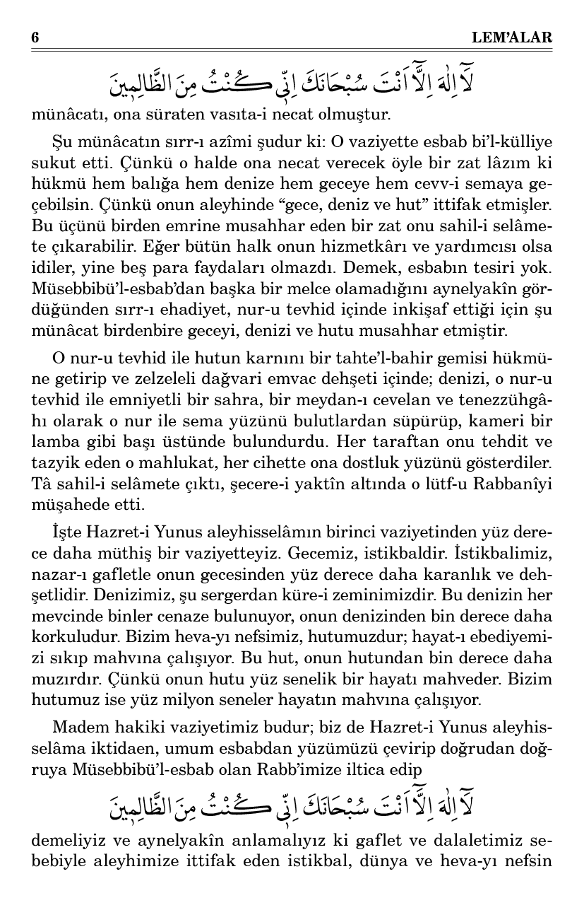 Madem hakikat-i hal böyledir. Nasıl ki Hazret-i Yunus aleyhisselâma o münâcatın neticesinde hutu ona bir merkûb, bir tahte’l-bahir ve denizi bir güzel sahra ve gece mehtaplı bir latîf suret aldı. Biz dahi o münâcatın sırrıyla