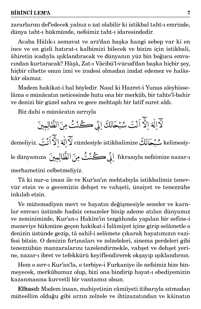 demeliyiz. لَٓا اِلٰهَ اِلَّٓا اَنْتَ cümlesiyle istikbalimize سُبْحَانَكَ kelimesiyle dünyamıza اِنّٖى كُنْتُ مِنَ الظَّالِمٖينَ fıkrasıyla nefsimize nazar-ı merhametini celbetmeliyiz.